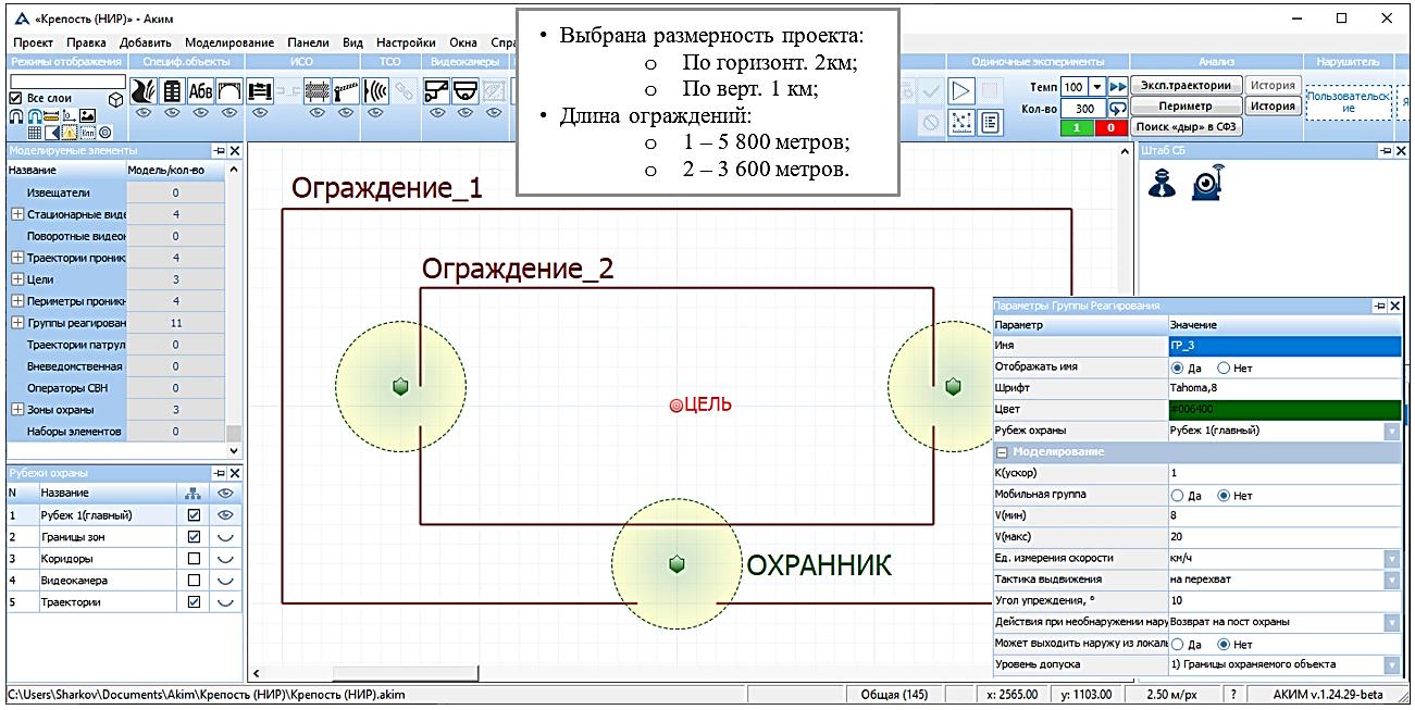 Результаты моделирования в среде АКИМ для 1 000 испытаний дали 957 успешных нейтрализаций нарушителя, что попадает в доверительный интервал от 0.9444 до 0.9696. Точечная вероятность составила 95.7 %, а обнаруживающая способность системы технических средств охраны – около 98.5 %.
