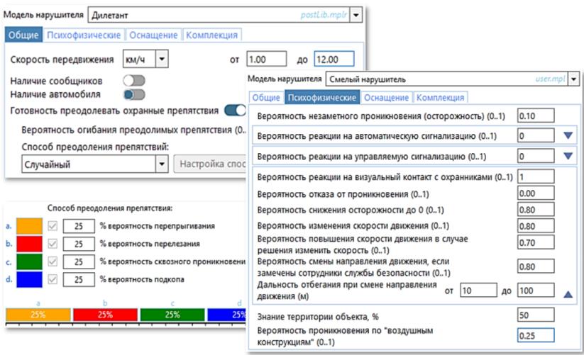 Рис. 7. Пример диалогов выбора характеристик для нарушителя