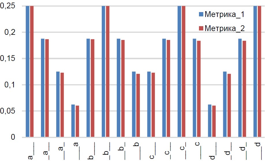 Рис. 3. Гистограмма результатов вычисления метрики_1 и метрики_2 для группы тестов 3 (для сравнения строк с «abcd»)
