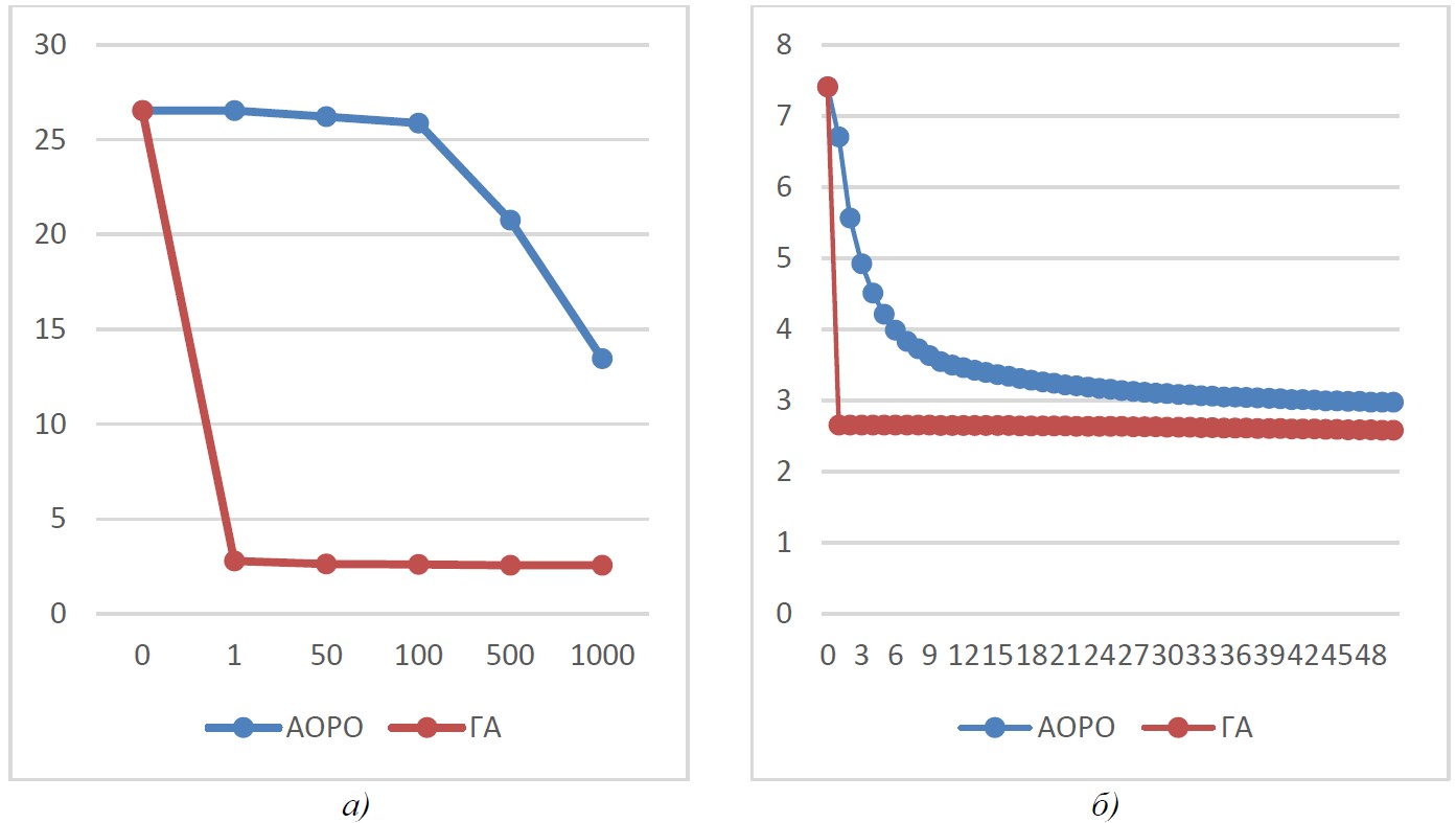 Рис. 3. Графики изменения RMSE на наборе BH для алгоритмов обучения АОРО и ГА: а) для ННС ANFIS; б) для ННС на основе БЛВ-модели НВ