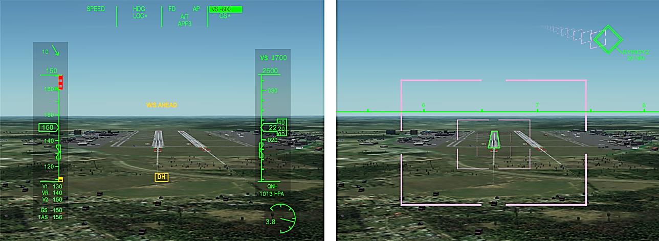 После отметки в 100 футов до касания взлетно-посадочной полосы остается не более 10 секунд. На таком коротком интервале самолет не может значительно изменить приборную или вертикальную скорость, поэтому главное – выравнивание самолета и своевременное увеличение угла тангажа в момент касания взлетно-посадочной полосы. Для этого пилоту требуется минимальное количество информации: радиовысота, шкала тангажа, FPV, авиагоризонт, синтезированное/улучшенное изображение полосы.