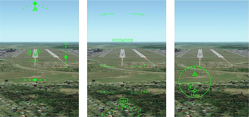 Fig. 2. Objects linked to FPV (left), to the airplane construction axis (center) and simultaneously linked to FPV and to the glasses position (right)