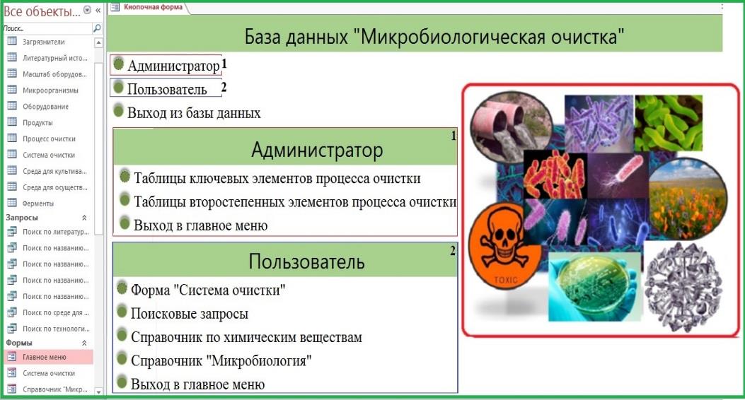 Рис. 2. Главное меню БД «Микробиологическая очистка» и вкладки для административной и пользовательской работы