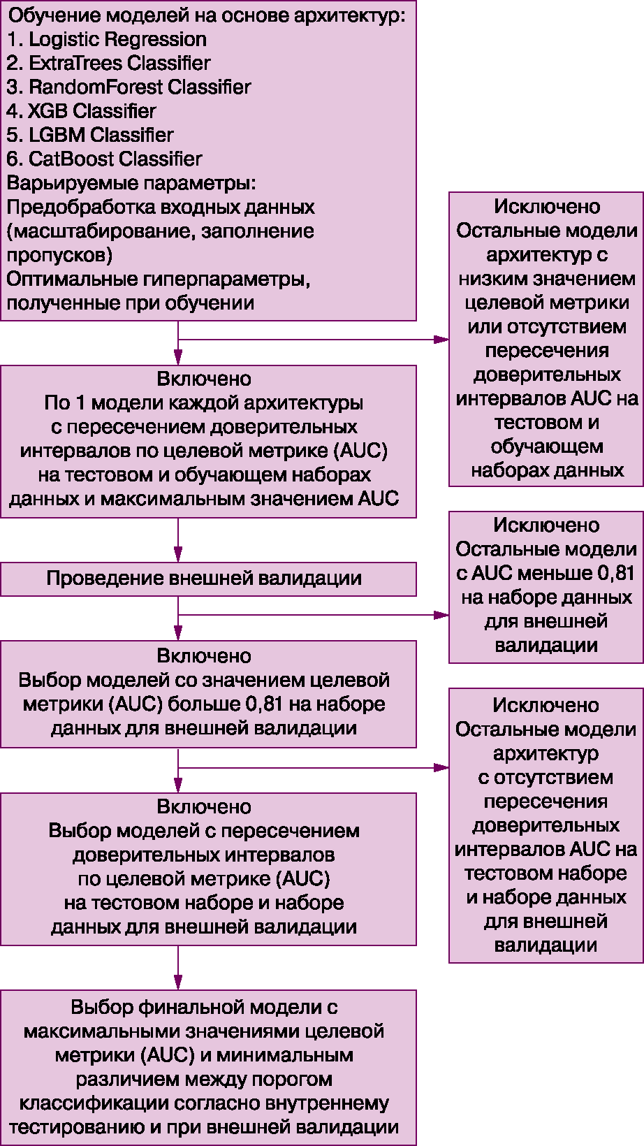 Отобранные согласно нашему алгоритму модели проходили внешнюю валидацию. Расчет матрицы ошибок и всех метрик качества в этом случае проводился с использованием порога классификации согласно внутреннему тестированию и максимума индекса Юдена, определенного на наборе данных для внешней валидации. Выбор финальной модели основывался на максимальном значении AUC при внешней валидации, пересечении доверительных интервалов метрики и минимальном различии между порогом классификации согласно внутреннему тестированию и при внешней валидации. Полная процедура отбора моделей представлена на рисунке 2.
