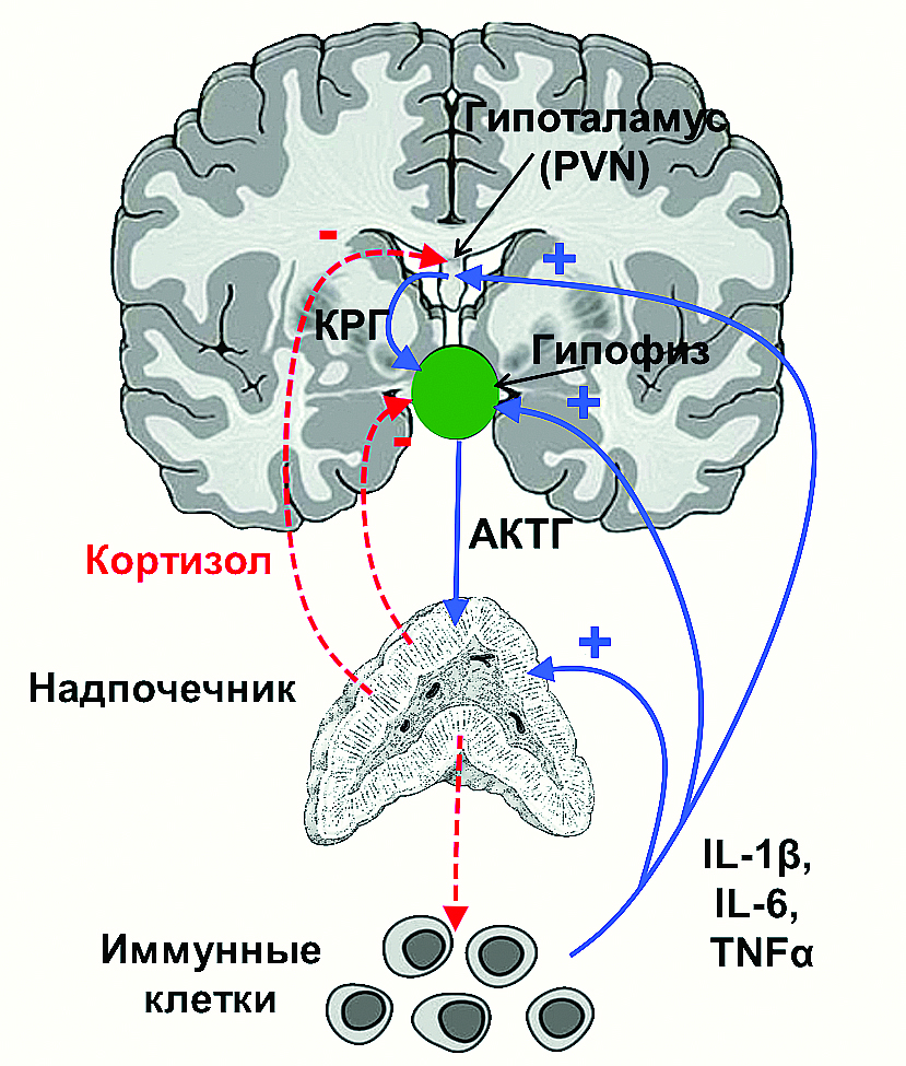 Рис. 2. Двунаправленная связь между ГГАКС и иммунной системой. Глюкокортикоиды оказывают негативное воздействие на иммунную систему, подавляя дальнейший синтез и высвобождение провоспалительных цитокинов (пунктирная красная линия). Глюкокортикоиды регулируют собственную продукцию посредством отрицательной обратной связи: через кортикотропин-рилизинг-гормон (КРГ) в паравентрикулярном ядре (PVN) гипоталамуса и АКТГ в передней доле гипофиза (пунктирная красная линия). Провоспалительные цитокины (TNF, IL-1 и IL-6) стимулируют высвобождение глюкокортикоидов, действуя на всех трех уровнях ГГАКС (сплошные синие линии).