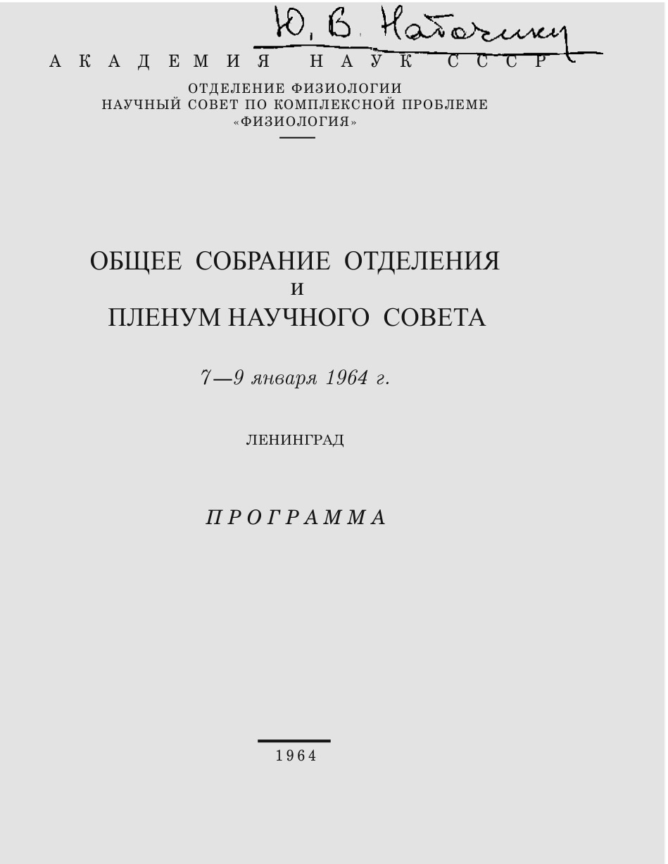 Отделение физиологии АН СССР провело первую научную сессию совместно с Научным советом по комплексной проблеме “Физиология” (рис. 2) в Ленинграде на базе Института физиологии им. И.П. Павлова в начале января 1964 г. На открытии сессии В.H. Черниговский сформулировал задачи нового Отделения (рис. 3). Удивительное, невероятное стечение обстоятельств в истории науки иногда внезапно преображается в естественную логику событий. В 1963 г. академик В.Н. Черниговский, только избранный академиком-секретарем Отделения физиологии, формирует повестку дня первого собрания Отделения совместно с Научным советом по комплексной проблеме “Физиология” (рис. 2). В истории существования Отделения физиологии АН СССР (затем РАН) с 1963 г. по 2002 г. было 5 академиков-секретарей – академики В.Н. Черниговский, Е.М. Крепс (рис. 4), П.Г. Костюк (рис. 5), П.В. Симонов (рис. 6), Ю.В. Наточин (табл. 3). В конце 1963 г. был напечатан пригласительный билет с программой первой сессии Отделения физиологии, которая состоялась с 7 по 9 января 1964 г. (рис. 2), она включала пленарные доклады. Каким прозрением надо было обладать академику В.Н. Черниговскому, готовившему это совещание, чтобы потом, десятилетия спустя, оказалось, что все 5 участников первой сессии Отделения физиологии АН СССР будут последовательно руководить работой созданного Отделения физиологии в течение всех последующих десятилетий его существования (рис. 3, 7–9), (табл. 3).
