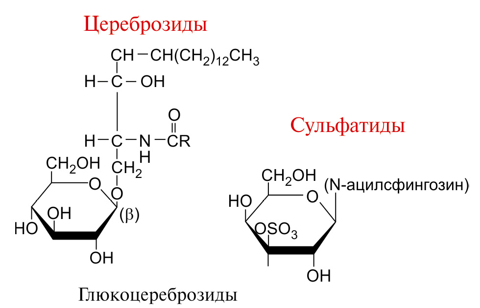 Усложнение организации ЦНС сопровождается увеличением содержания цереброзидов – сложных гликосфинголипидов на основе сфингозина, жирной кислоты и ковалентно присоединенных остатков галактозы или глюкозы. Возрастает количество сульфоцереброзидов – цереброзидов, содержащих сульфат (рис. 7). Они являются специфическими липидными компонентами миелина. В ходе эволюции позвоночных наблюдаются изменения жирнокислотного состава цереброзидов – с усложнением организации увеличивается количество длинноцепочечных насыщенных (лигноцериновая С24:0) и моноеновых (нервоновая С24:1) и снижается доля более коротких пальмитиновой С16:0 и стеариновой С18:0, увеличивается количество гидроксикислот. Аналогичные процессы происходят в ходе онтогенеза. Незрелый мозг млекопитающих по этим параметрам очень похож на мозг примитивного позвоночного миноги, у которой отсутствует миелин.