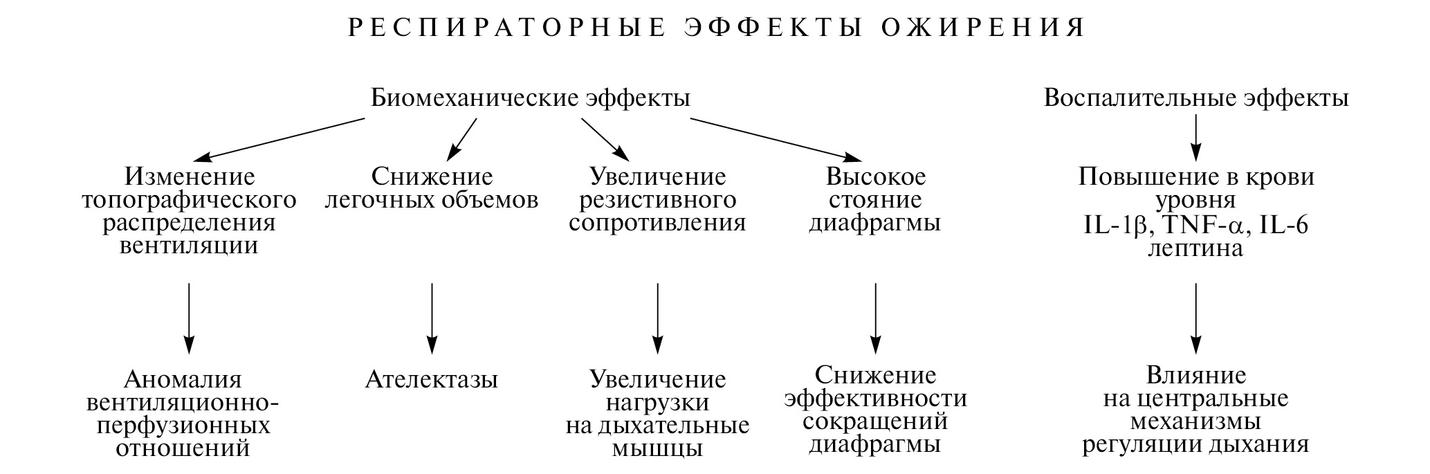 Медиаторы воспаления, продуцируемые в жировой ткани, проникают в периферическое кровообращение и способствуют развитию субклинического хронического системного воспаления. Каждый из вырабатываемых жировой тканью цитокинов может отрицательно влиять на функционирование легких как на органном, так и на системном уровне: цитокин-опосредованные механизмы могут способствовать развитию респираторной мышечной дисфункции [4], влиять на рефлекторные механизмы регуляции дыхания, ослаблять вентиляционную чувствительность к гипоксиии и гиперкапнии, ухудшая компенсаторные возможности системы внешнего дыхания [7].