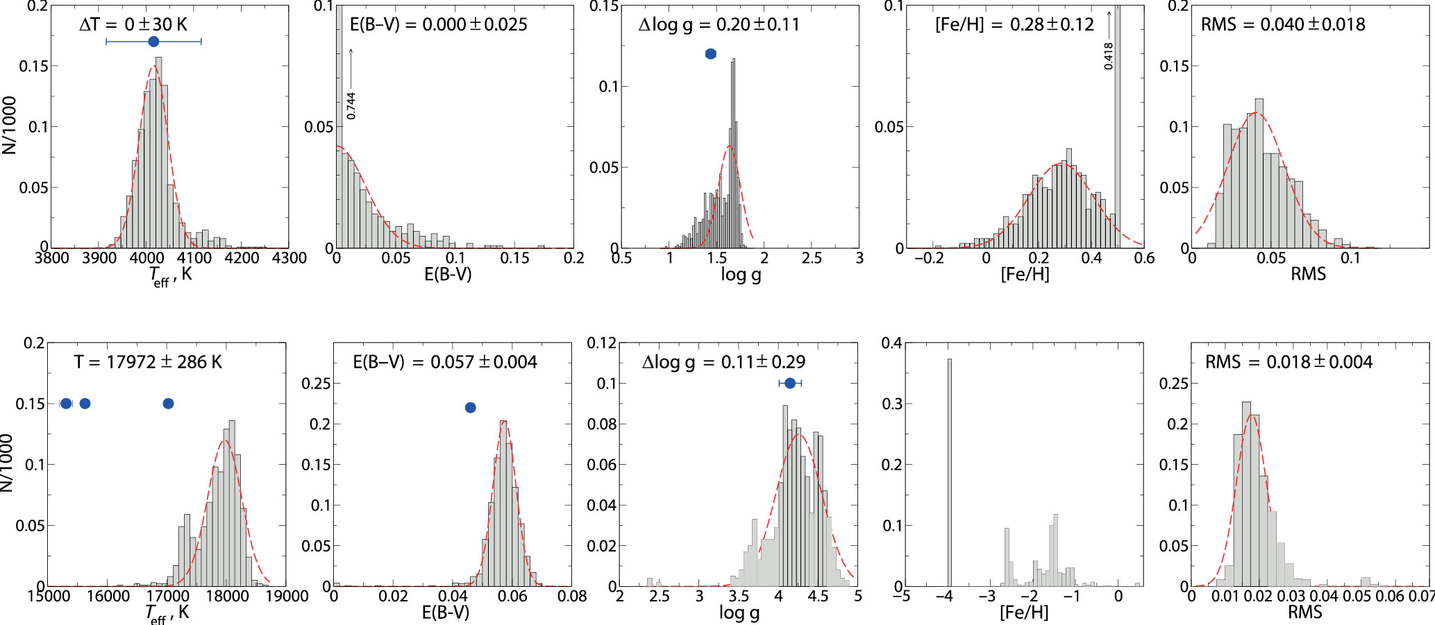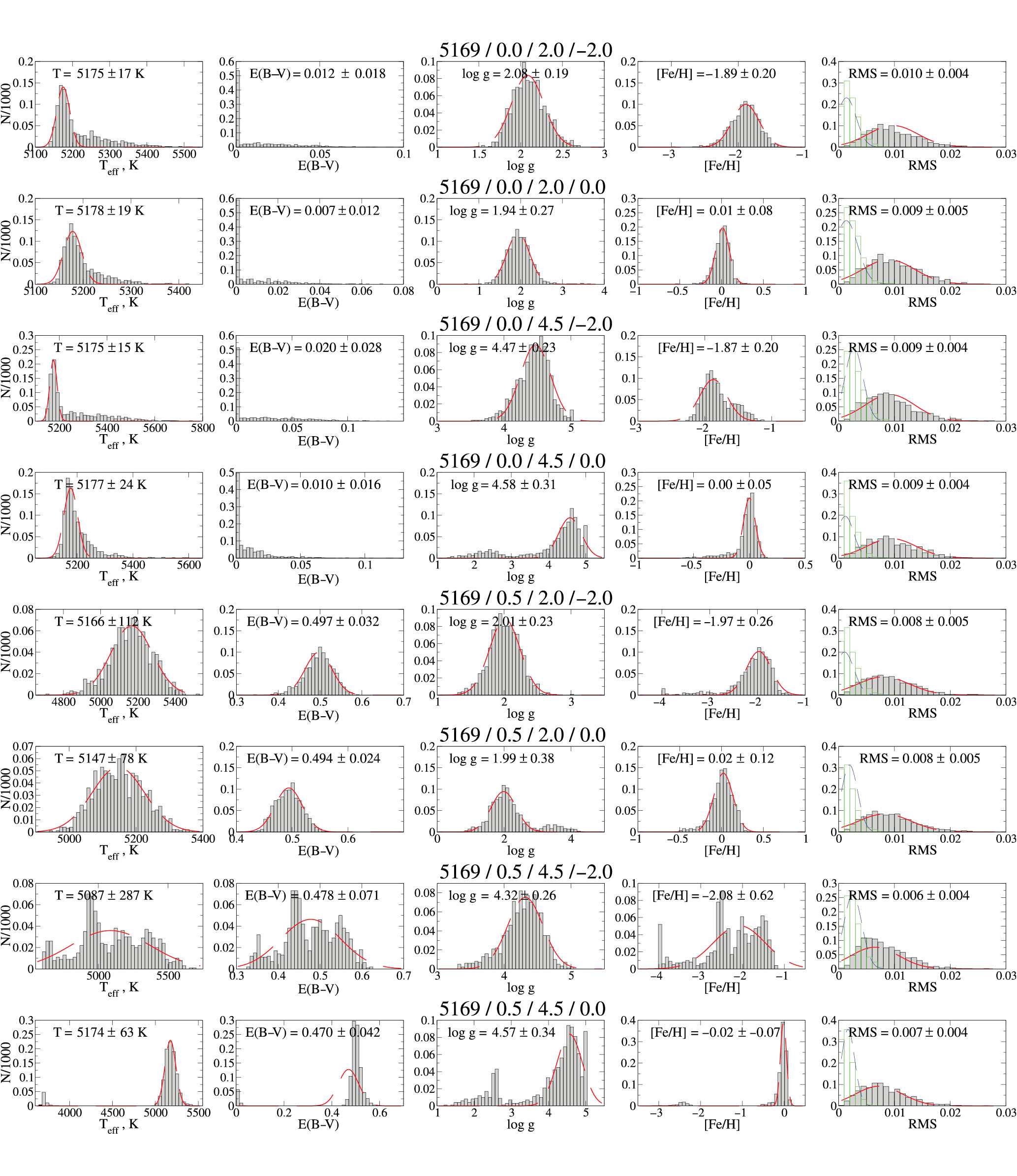 Для каждого набора параметров мы рассчитали синтетические звездные величины в полосах UBVRIJHK, используя данные созданной сетки, описанные в подразделе 1.1. На первом этапе мы использовали именно эти величины для проверки качества метода нахождения глобального минимума. Все решения были найдены точно. На следующем этапе мы добавили шум. Значения ошибок 0.005 и 0.02m были приняты для диапазонов UBVRI и JHK соответственно. Первое значение было выбрано как типичное значение для достаточно точной фотометрии. Второе – как типичное значение ошибок в каталоге 2MASS для звезд 8.5 < Ks(mag) < 13 (Скрутски и др., 2006). Для моделирования наблюдений и оценки неопределенностей параметров мы добавили к синтетическим звездным величинам случайный шум с гауссовым распределением и использовали их в качестве входных данных в разработанном нами методе минимизации. Было выполнено 1000 таких вычислений. Пример распределения восстановленных параметров для точки N2 (69 K) показан на рис. 3. Те же данные для всех точек тестирования доступны в дополнительных материалах. Нормальное распределение ошибок наблюдений не всегда приводит к нормальному распределению значений восстанавливаемого параметра. Несколько выраженных максимумов и сложные распределения видны на рис. 3. Но основной максимум очень близок к начальному значению. Этот тест показывает, что с наибольшей вероятностью будут получены правильные значения параметров. Однако возможно получить и ошибочные значения. Например, случай с параметрами (5169/0.5/4.5/–2.0) – для эффективной температуры, покраснения и металличности, случаи (5169/0.5/4.5/0.0) и (5169/0.0/4.5/0.0) – для ускорения силы тяжести.