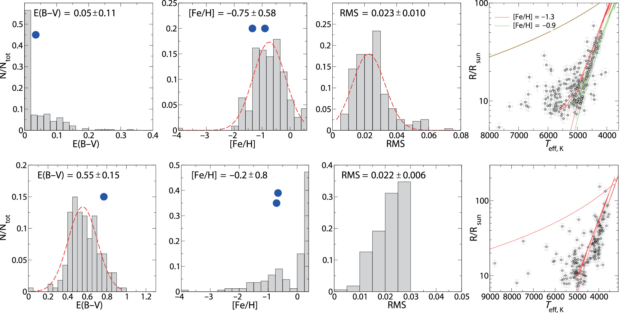 2.5.2. NGC7142. Сан и др. (2020) выполнили UBVRI-фотометрию 8702 звезд в направлении старого рассеянного скопления NGC7142. 1769 звезд имеют измерения во всех нужных нам диапазонах и представлены в каталоге 2MASS (Скрутски и др., 2006). Более 70% значений UBVRI имеют ошибку менее 0.01m. Около 30% значений JHK имеют погрешность менее 0.03m, около 60% имеют погрешность менее 0.05m, мы выбрали последнее значение, чтобы ограничить ошибки наблюдений. На рис. 10 (в центре) показано распределение избытка цвета E(B–V) и металличности [Fe/H]. Процент использования звезд, определенный пределом по RMS, влияет на средние значения параметров. Средние значения E(B–V) = 0.30 ± 0.15 и [Fe/H] = –0.19 ± 0.43 получены по всем звездам, E(B–V) = 0.29 ± 0.13 и [Fe/H] = –0.16 ± 0.33 для звезд с RMS < 0.05m и E(B–V) = 0.30 ± 0.13 и [Fe/H] = –0.02 ± 0.21 для звезд с RMS ≤ 0.02m. Сан и др. (2020) дают значения E(B–V) = 0.338 ± 0.031 и [Fe/H = 0.0 ± 0.1. Диас и др. (2002)] опубликовали E(B–V) = 0.350, log t = 9.550 и [Fe/H] = 0.08. Значения E(B–V) = 0.450 и log t = 9.250 получены Харченко и др. (2016). Дисперсия полученных нами значений E(B–V) велика (E(B–V) ≈ 0 … 0.6m), несмотря на хорошее согласие среднего значения. Систематический сдвиг положений звезд ветви красных гигантов относительно изохроны MESA виден на диаграмме Teff – R. Вероятно повлияла небольшая недооценка покраснения.