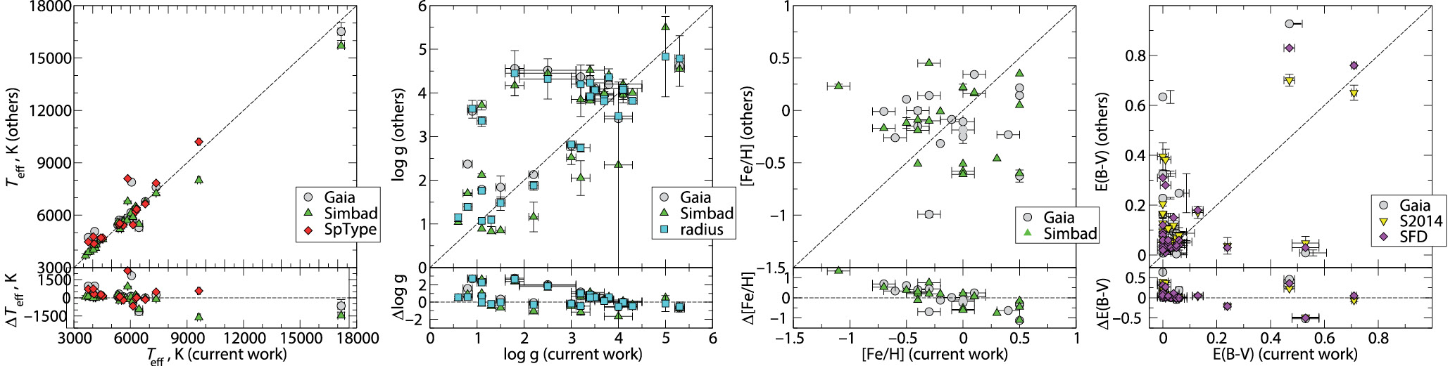 Мы объединили данные фотометрии UBVRI из архива Stetson 3, JHK из каталога 2MASS (Скрутски и др., 2006) и использовали каталог Pastel (Субиран и др., 2016) для поиска общих звезд, имеющих точные фотометрические данные и оценку звездных параметров. Подходящими оказались только две звезды.