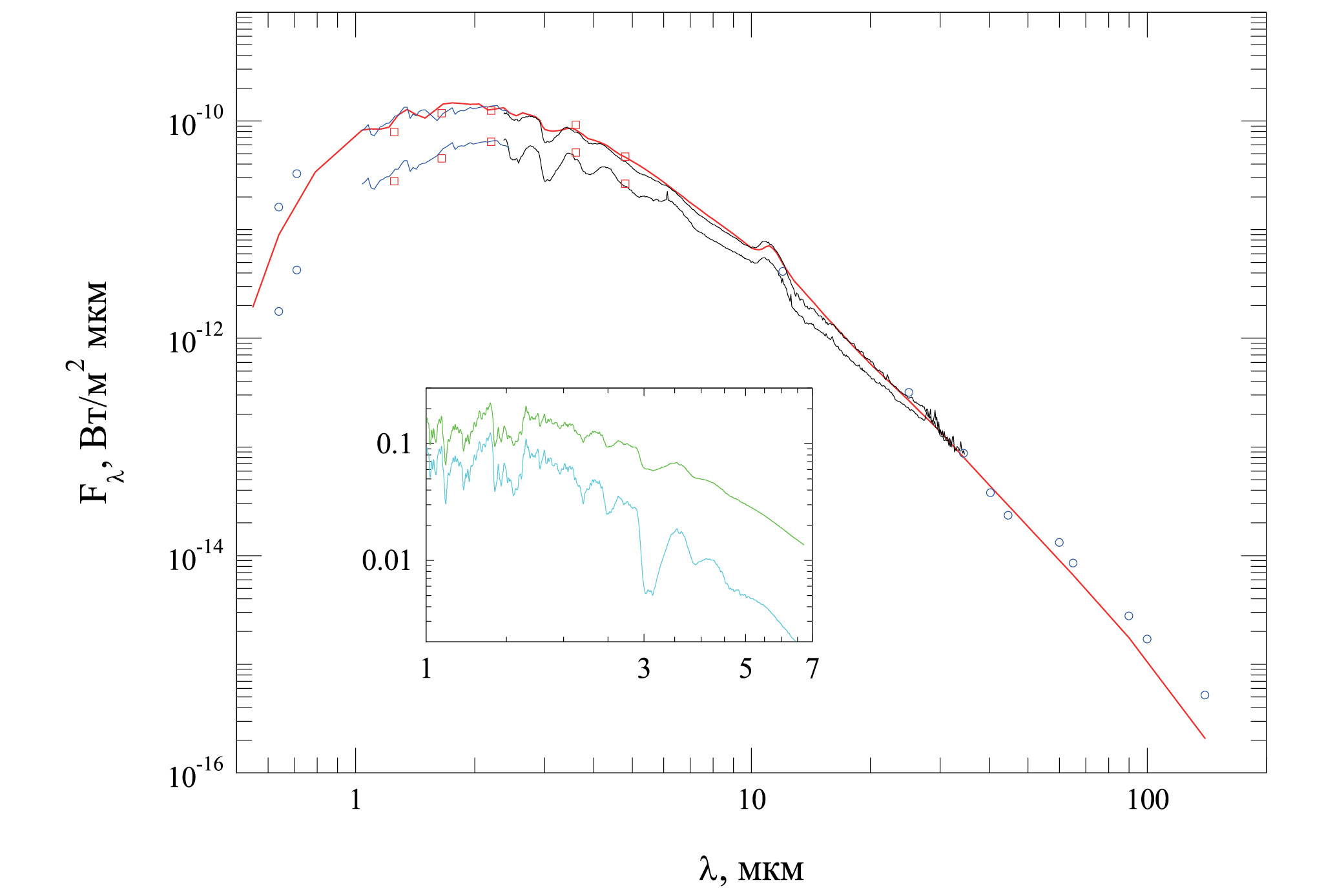 Рис. 5. Наблюдаемое SED T Dra в максимуме и минимуме блеска. Черные линии – спектры ISO, синие линии – спектры КГО, красные символы – JHKLM фотометрия КАС, синие символы – литературные данные и данные AAVSO, красная линия – модельный SED. На врезке голубой линией показан фрагмент синтетического спектра углеродной звезды с Teff = 2400 K и C/O = 1.4 из работы Арингера и др. (2009) и модельный спектр излучения звезды с пылевой оболочкой – зеленая линия.