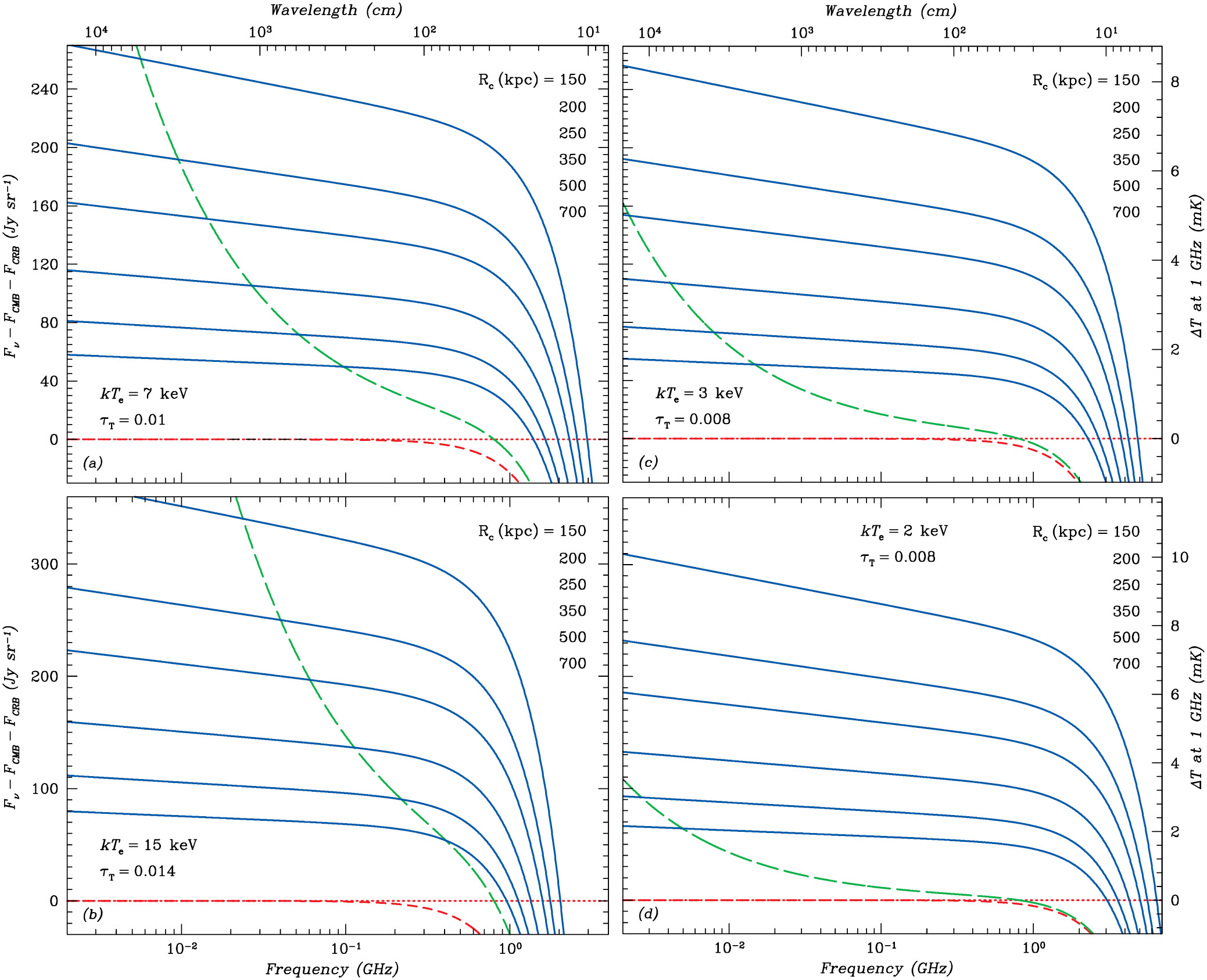 На рис. 8 приведены искажения спектра радио- и микроволнового фона в таком скоплении, ожидаемые из-за комптоновского рассеяния на электронах (зеленые штрихи) и вклада теплового тормозного излучения (синие сплошные линии) на двух придельных расстояниях ρ = 0 и 0.5 Rc. Параметры газа, радиальная томсоновская толща τс = 3 × 10–3 и температура электронов kTe = 5 кэВ, выбраны такими же, как у скопления с однородным распределением плотности на рис. 2. Рассмотрены разные значения радиуса ядра скопления Rc. Видно, что комптоновские искажения фона по центру скопления (ρ = 0) на рис. 2 и 8 действительно одинаковы, в силу равенства оптических толщ, однако интенсивность теплового излучения газа реального скопления оказывается в π раз меньше интенсивности излучения скопления с однородным распределением плотности газа.