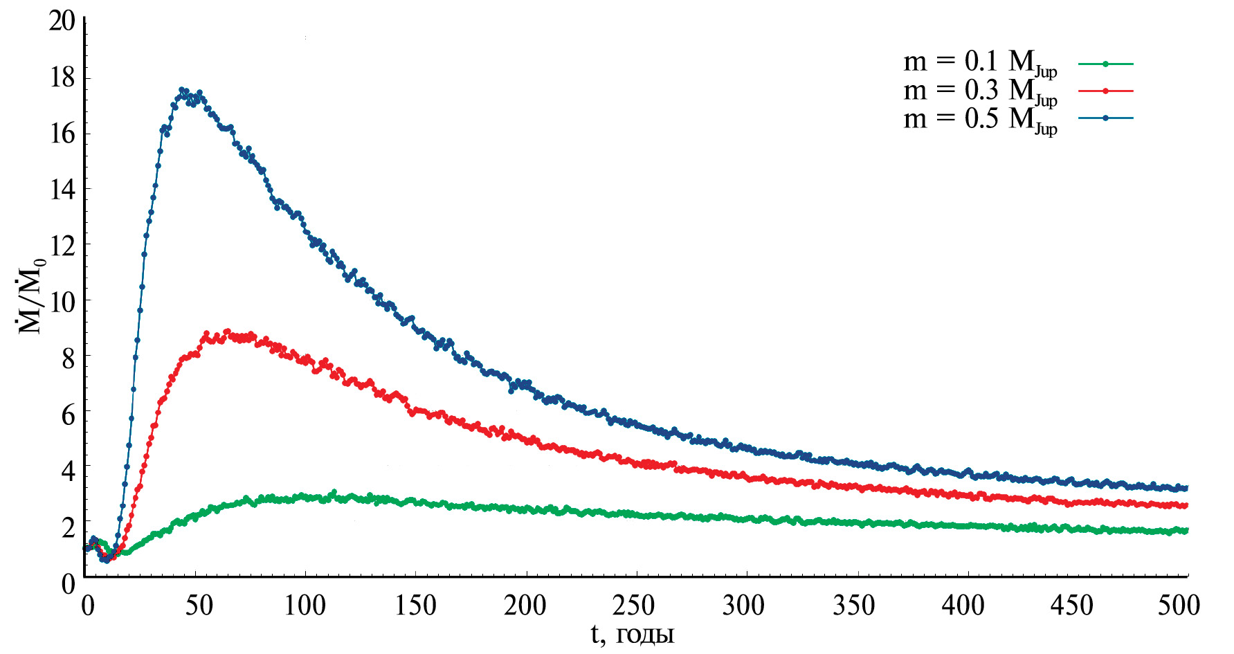 На рис. 2 показан всплеск темпа аккреции, вызванный падением на диск в момент газового сгустка из околозвездного окружения звезды. Место его падения на диск находится на расстоянии а.е. от звезды. Аккреционный всплеск начинается в тот момент, когда волна возмущения в диске, вызванная падением сгустка, достигает ближайших окрестностей звезды. В максимуме вспышки темп аккреции превышает таковой в невозмущенном состоянии диска (/г) примерно в 3 раза в случае ( – масса Юпитера), 9 раз при и в 18 раз при . Кроме того, с увеличением начальной массы сгустка сокращается время между началом роста темпа аккреции и достижением его максимального значения.