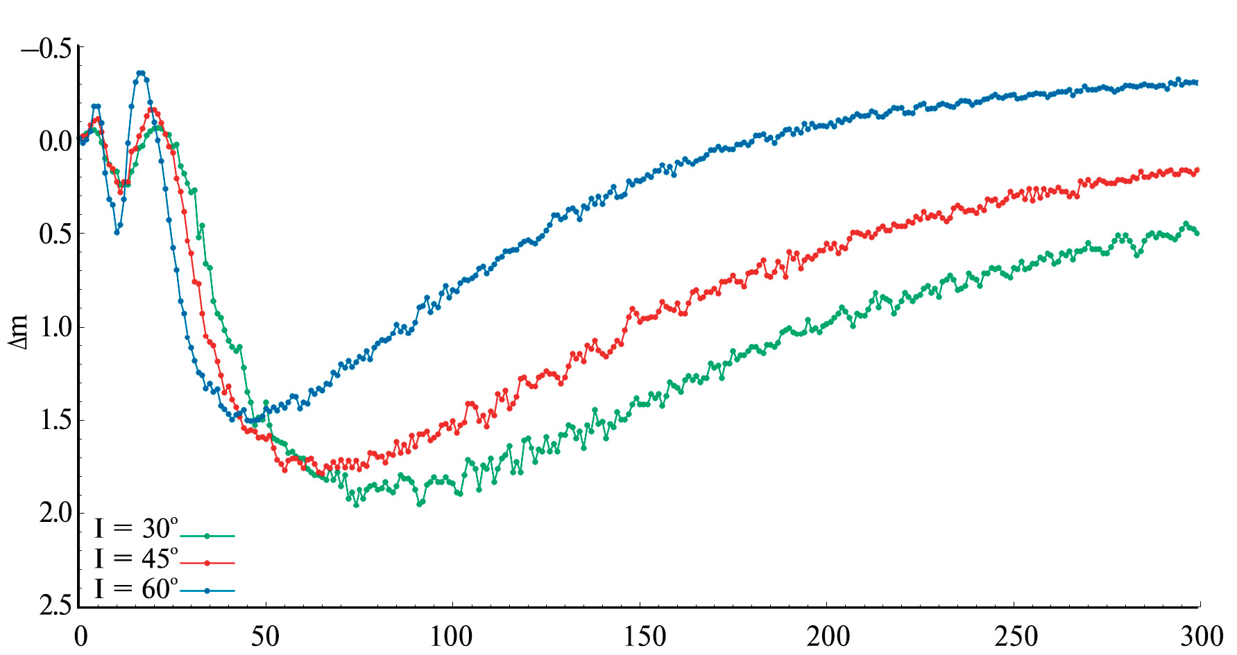 Теоретические кривые блеска показаны на рис. 3–5. Видно, что с уменьшением расстояния между возмущением и звездой блеск убывает быстрее, а фаза минимума становится короче (рис. 3). Похожим образом на кривую блеска влияет уменьшение параметра L (рис. 4) и увеличение угла падения I (рис. 5). Расчеты показали, что вариации параметра в пределах – не оказывают заметного влияния на поведение кривой блеска.