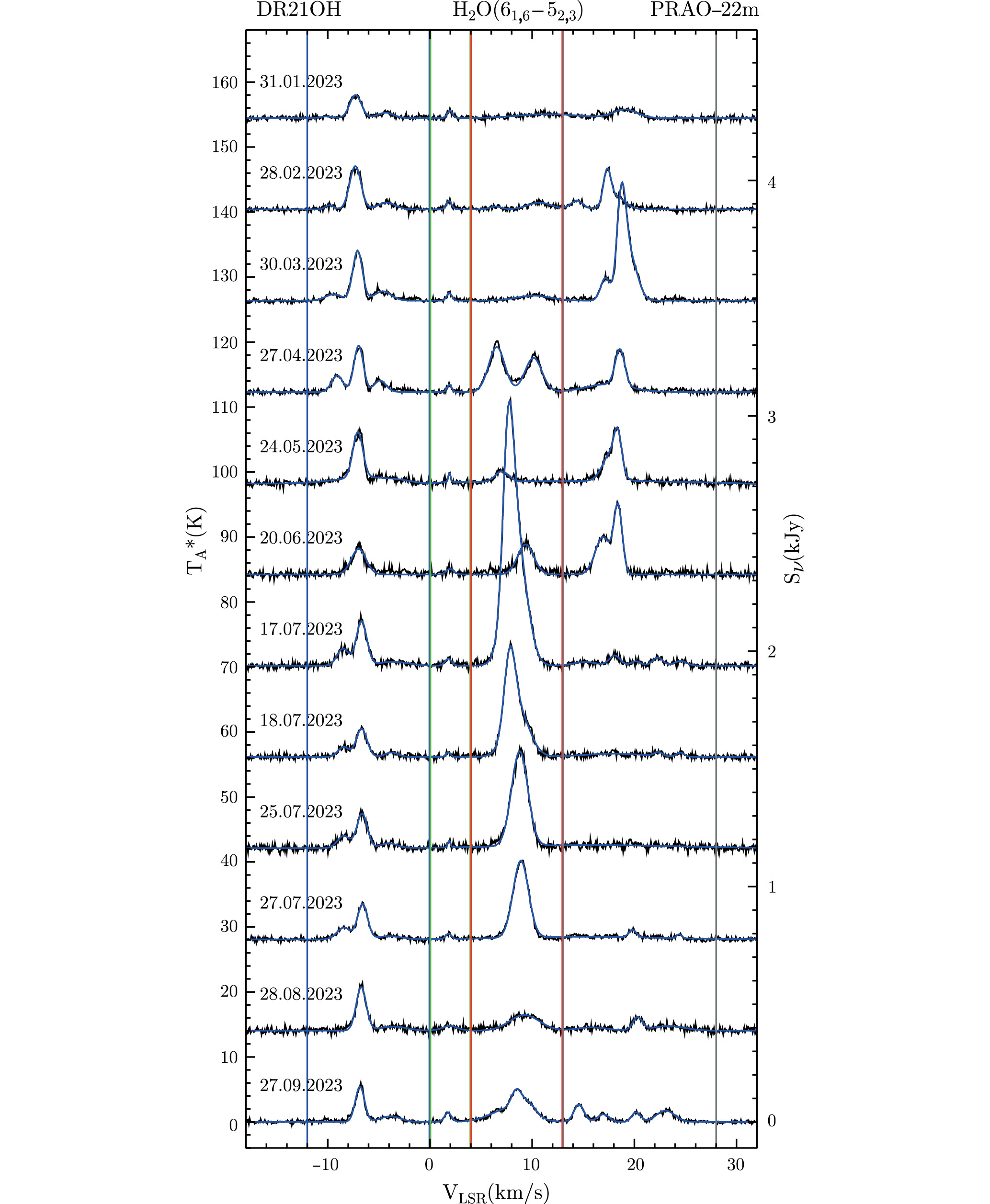 Рис. 3. Поведение мазера H2O в DR21OH в 2023 г. Шкала справа в Ян соответствует Aeff = 100 м2, определенной по измерениям континуума в DR21, и соответствует чувствительности 27.6 Ян/К. Вертикальными линиями показаны интервалы лучевых скоростей [–12, 0] км/c (синим), [0, 4] км/c (зеленым), [4, 13] км/c (красным) и [13, 28] км/c (серым), внутри которых поведение мазерных компонент может рассматриваться обособленно от соседних.
