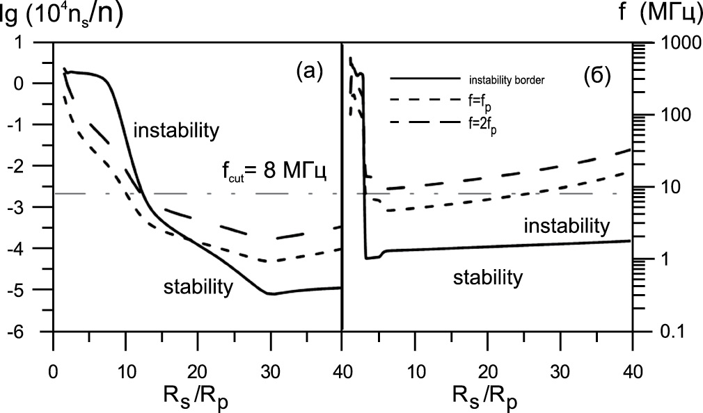 В обычных условиях регистрация радиоизлучения радиоастрономическими средствами, расположенными на Земле, возможна на частотах выше плазменной частоты в ионосферном максимуме, fcut ≥ 8 МГц. Это условие ограничивает положение плазменного источника, от которого можно зарегистрировать радиоизлучения на плазменной частоте, областью, близкой к поверхности планеты, R ≤ 10Rp при умеренном ветре (рис. 2а), и областями R ≤ 3Rp и R ≥ 25Rp при интенсивном ветре (рис. 2б). Ситуация кардинально меняется при генерации радиоизлучения на удвоенной плазменной частоте при большой интенсивности звездного ветра (рис. 2б). В этом случае генерация излучения выше частоты fcut возможна во всей плазмосфере.