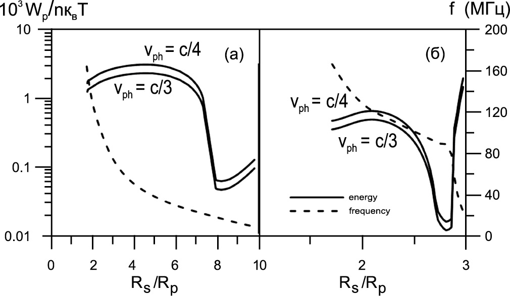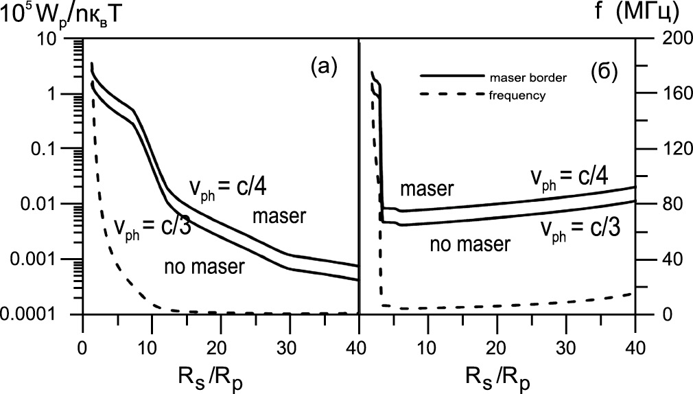 Из рис. 4 следует, что в зависимости от интенсивности звездного ветра требования к плотности энергии плазменных волн существенно меняются. При сильном ветре необходимая плотность приблизительно на порядок ниже, чем при умеренном, что связано с уменьшением протяженности плотной части плазмосферы экзопланеты. На рис. 4б приведена необходимая плотность плазменных волн только в ближайшей к экзопланете области генерации (R ≤ 3Rp). Оценки показывают, что в более далекой (R ≥ 25Rp) области возможной генерации радиоизлучения с частотой выше fcut необходимая относительная плотность энергии существенно выше, Последнее связано в первую очередь с низкой плотностью равновесной плазмы на периферии плазмосферы экзопланеты.