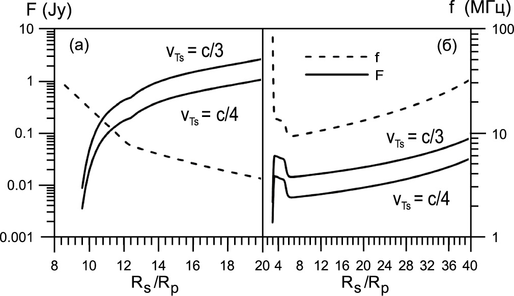 На рис. 5а приведены потоки радиоизлучения на уровне Земли на удвоенной плазменной частоте при плотности энергии плазменных волн Wp = 10–3nkBT для различных скоростей энергичных электронов в случае плазмосферы, взаимодействующей со звездным ветром умеренной (рис. 5а) и большой интенсивности (рис. 5б). При этом предполагалось, что площадь источника радиоизлучения в плазмосфере на расстоянии R, соответствующем плазменной частоте ωL ≈ wt/2, равна максимальной S = 2πR2.