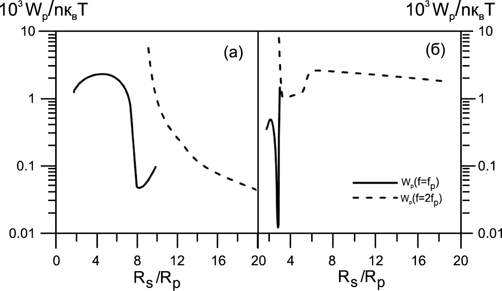 Из рис. 6а следует, что достаточно низкие Wp = 10–3nkBT плотности энергии плазменных волн, необходимые для формирования потоков радиоизлучения, доступных для наблюдения современными радиоастрономическими средствами, соответствуют диапазону частот ft ≤ 20 МГц. Увеличение интенсивности звездного ветра (рис. 6б) приводит к смещению частотного спектра в область более высоких частот, 10–30 МГц, и к возрастанию примерно на порядок величины необходимой плотности энергии плазменных волн.