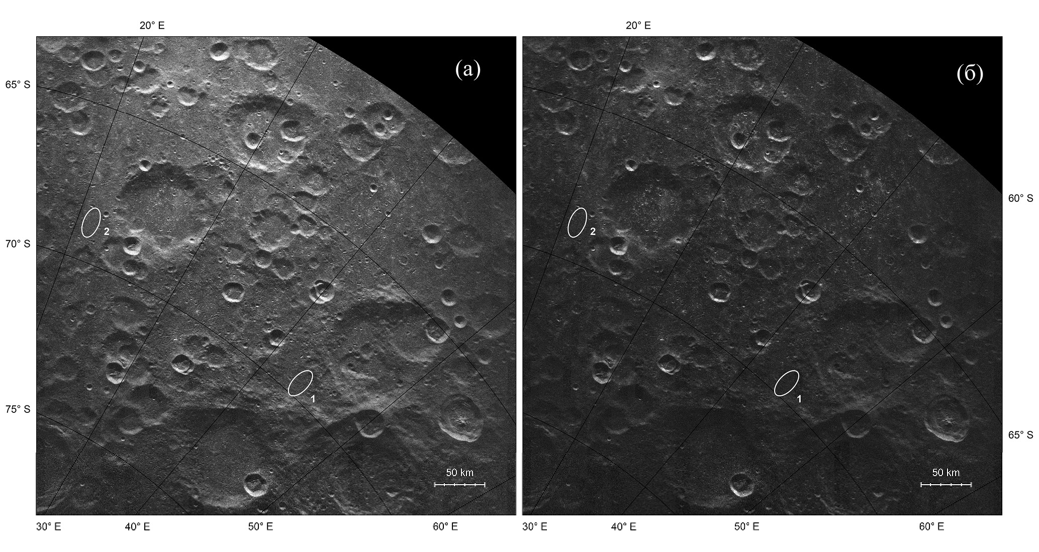 Рис. 1. Радиолокационные изображения зеркальной (а) и диффузной (б) компонент эхо-сигнала. Предполагаемые основной (1) и резервный (2) “эллипсы разброса” мест посадки КА Луна-25. Изображения привязаны к селенографической системе координат и представлены в ортографической проекции с центром в южном полюсе Луны.