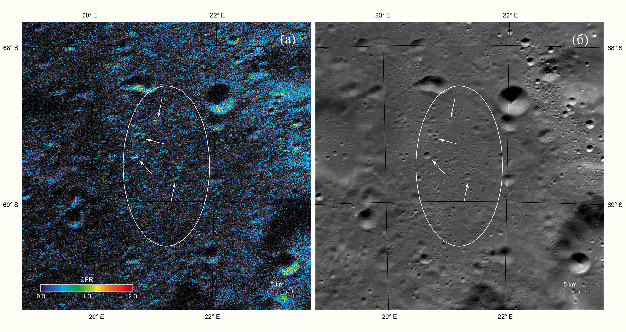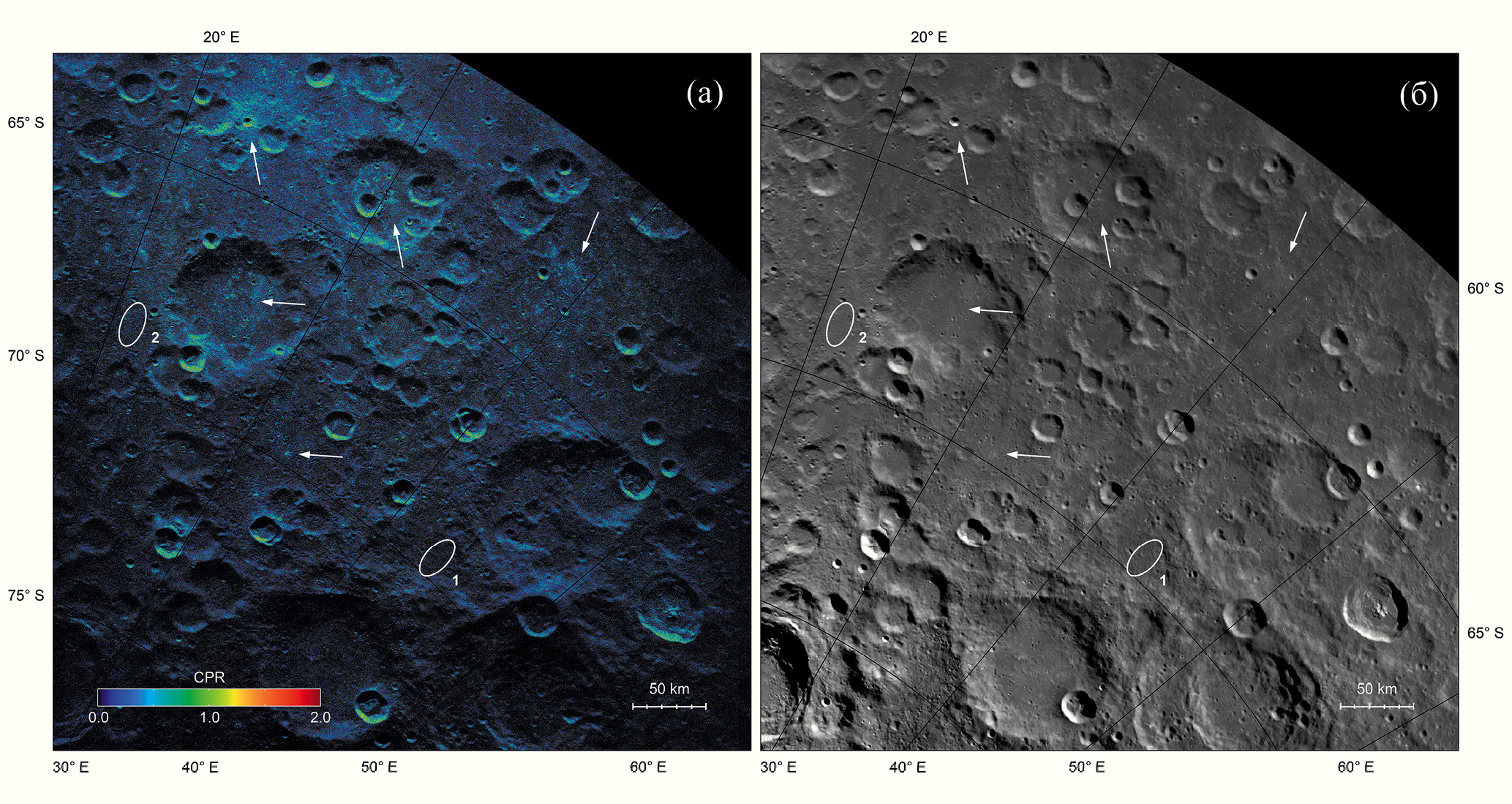 На рис. 1 радиолокационное изображение напоминает фотографию в оптическом диапазоне. На нем заметны крупные формы рельефа, а также имеются тени, которые удлиняются к югу по мере увеличения угла падения сигнала θ. Изображение зеркальной компоненты эхо-сигнала, в отличие от диффузной, – более яркое, поскольку содержит большую часть отраженной мощности. Однако на изображении диффузной компоненты отчетливо видны отдельные яркие области, которым соответствует многократное переотражение сигнала на неоднородностях, сопоставимых с длиной волны. Карты значений CPR для таких областей позволяют оценить количество и распределение камней на поверхности и в приповерхностном слое реголита. Мы наложили значения CPR на радиолокационное изображение зеркальной компоненты эхо-сигнала (рис. 2а) и сравнили с изображением, полученным с помощью оптических камер инструмента LROC (Робинсон и др., 2010) (рис. 2б). Оба изображения приведены в селенографической системе координат в ортографической проекции с центром в южном полюсе Луны и в одинаковом масштабе. На рис. 2а значения CPR отображаются в диапазоне от 0 до 2, причем нулевым значениям соответствуют области, находящиеся в радиолокационной тени, а для областей с экстремально сильным диффузным рассеянием значения доходят до 1.8. Стрелками отмечены места с относительно высокими значениями CPR, некоторые из которых коррелируют с соответствующими местами на оптическом изображении, а другие – нет. Эти различия связаны с тем, что часть камней находится на поверхности реголита и заметна на оптическом изображении, а другая часть присутствует в толще реголита на глубине проникновения радиолокационного сигнала.