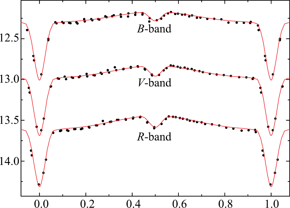 предложенной в работе (Берман и др., 2012). Полученные наблюдаемые кривые блеска в полосах , и показаны на рис. 1. Отметим, что использованная нами эфемерида не учитывает переменность орбитального периода, связанную с наличием в V1828 Aql двух или более массивных планет (Алмейда и др., 2012). К настоящему времени в литературе отсутствует эфемерида, обеспечивающая точность определения фазы на эпоху наших фотометрических наблюдений лучше . Поскольку уточнение эфемериды не входило в задачи данной работы, то вычисленные нами значения фаз содержали погрешности до , скорректированные вручную при сравнении наблюдаемых и модельных кривых блеска.