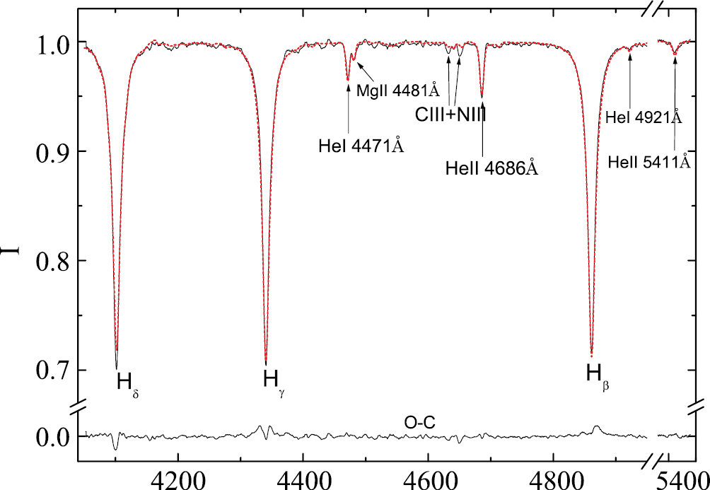 Итоговое согласование наблюдаемого и модельного спектров представлено на рис. 2. Полученные нами оценки параметров атмосферы в пределах ошибок определения совпадают с результатами анализа Алмейда и др. (Алмейда и др., 2012): K, , [He/H] = . Поэтому значение эффективной температуры sdB-субкарлика можно считать найденным с ошибкой не более K, что достаточно для его применения при последующем анализе кривых блеска V1828 Aql.