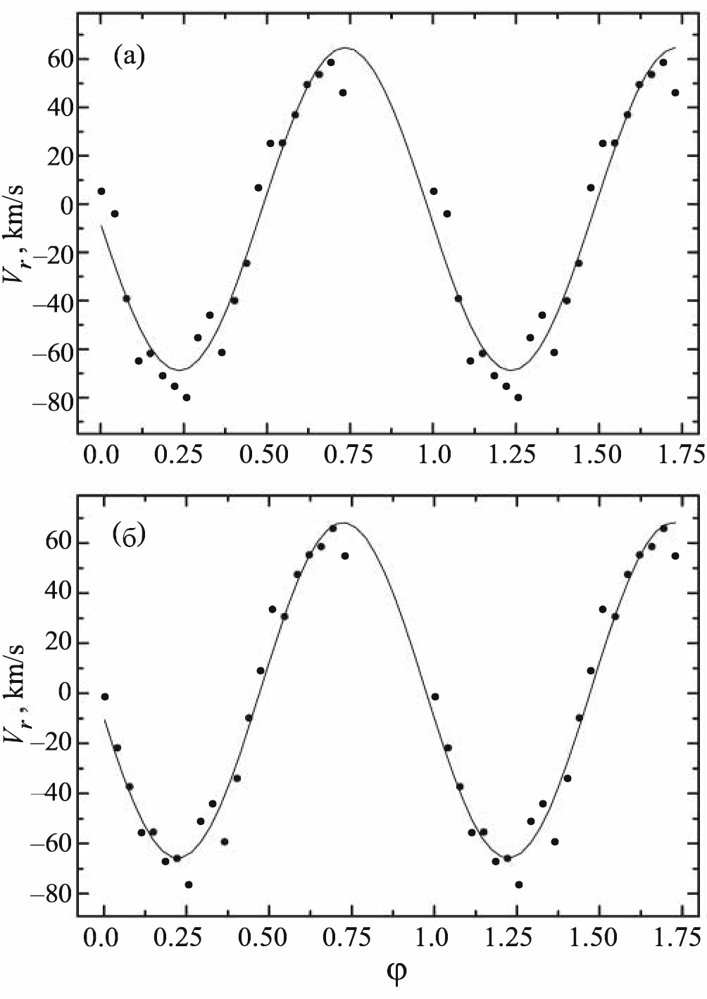 Наличие у V1828 Aql эллиптической орбиты является крайне маловероятным вследствие мощного приливного взаимодействия компонент в системах с . Поэтому наборы измеренных аппроксимированы в рамках модели кругового движения с получением значений их полуамплитуд и γ-скоростей, представленных в табл. 2. Очевидно, что величины для всех линий HI совпадают в пределах км/с и меньше ошибок их определения. Оценки и по линиям HeI и HeII существенно отличаются от данных по линиям HI, что обусловлено низкой интенсивностью линий гелия по сравнению с уровнем шумов. Однако небольшая полуширина линий HeI и HeII позволяет дополнительно повысить на 10–12% точность измерения лучевых скоростей sdB-субкарлика при их включении в совместный кросс-корреляционный анализ спектров.