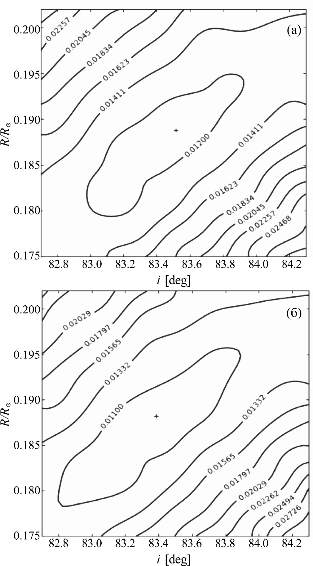 Таким образом, моделирование проводилось с варьированием радиусов вторичной и главной компонент и угла наклона орбиты до наилучшего согласования наблюдаемых и модельных кривых блеска. Выполнение этого условия определялось достижением минимумов среднеквадратичными уклонениями и в фильтрах и с визуальным контролем отсутствия трендов в зависимостях разностей блеска от фазы орбитального периода. Наличие шумов в фотометрических данных исключало возможность одновременного достижения минимумов в трех полосах. Поэтому при выборе итогового решения наибольший вес имели результаты в полосах и , а данные в полосе считались контрольными. При согласовании модельных и наблюдаемых кривых блеска учитывалось, что на амплитуду эффектов отражения кроме температуры в основном влияет радиус , а на форму, глубину и отношение глубин затмений – радиусы и совместно с углом . Поэтому предварительная оценка получена из моделирования внезатменных изменений блеска, а оценки и – из моделирования профилей затмений. Последующее уточнение этих оценок выполнено с применением численных критериев, как описано выше. Значения ошибок параметров заданы условием роста ошибки модели на 50% относительно ее минимального значения. Величина , определяемая разницей среднеквадратичных уклонений и ошибок фотометрических наблюдений для каждой фотометрической полосы в точке глобального минимума, составила в разных фильтрах. На рис. 6 представлены двумерные зависимости среднеквадратичных уклонений и от значений и с указанием точек глобального минимума. Итоговый набор параметров V1828 Aql, полученных при анализе кривых блеска, обобщен в табл. 3, а сравнение модельных и наблюдаемых кривых блеска во всех полосах показано на рис. 1.