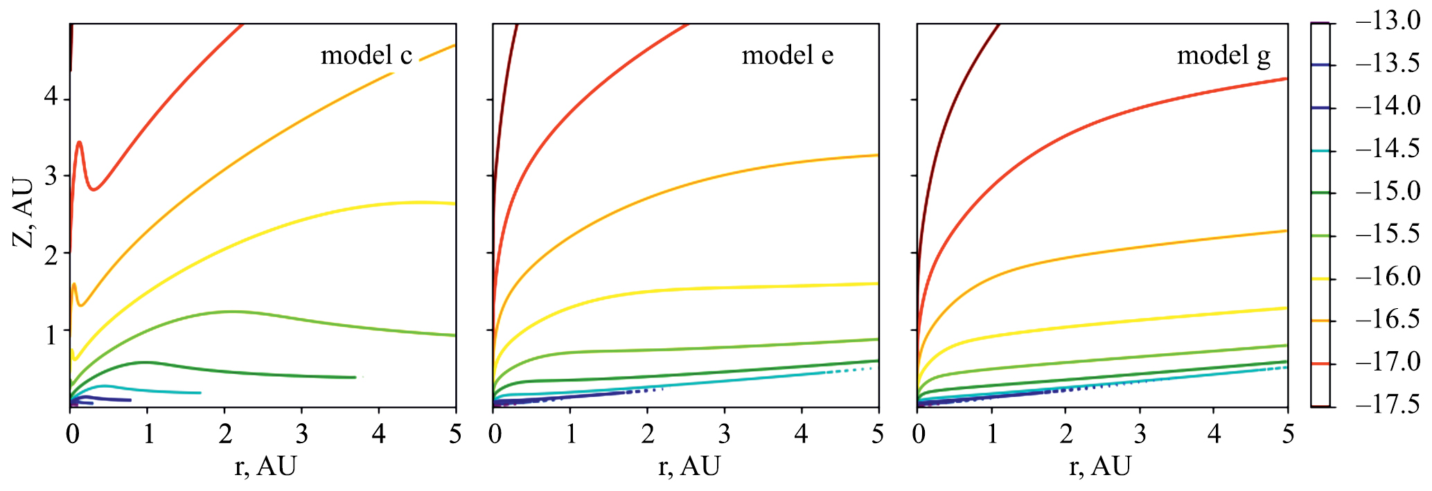 На рис. 1 представлены графики с изоденсами. Они показывают, что распределение плотности может сильно отличаться в разных моделях ветра. Модель С характеризуется крутым подъемом ветра над плоскостью диска и наибольшей плотностью вещества, а модель G – наименьшей. Модель E занимает промежуточное положение.