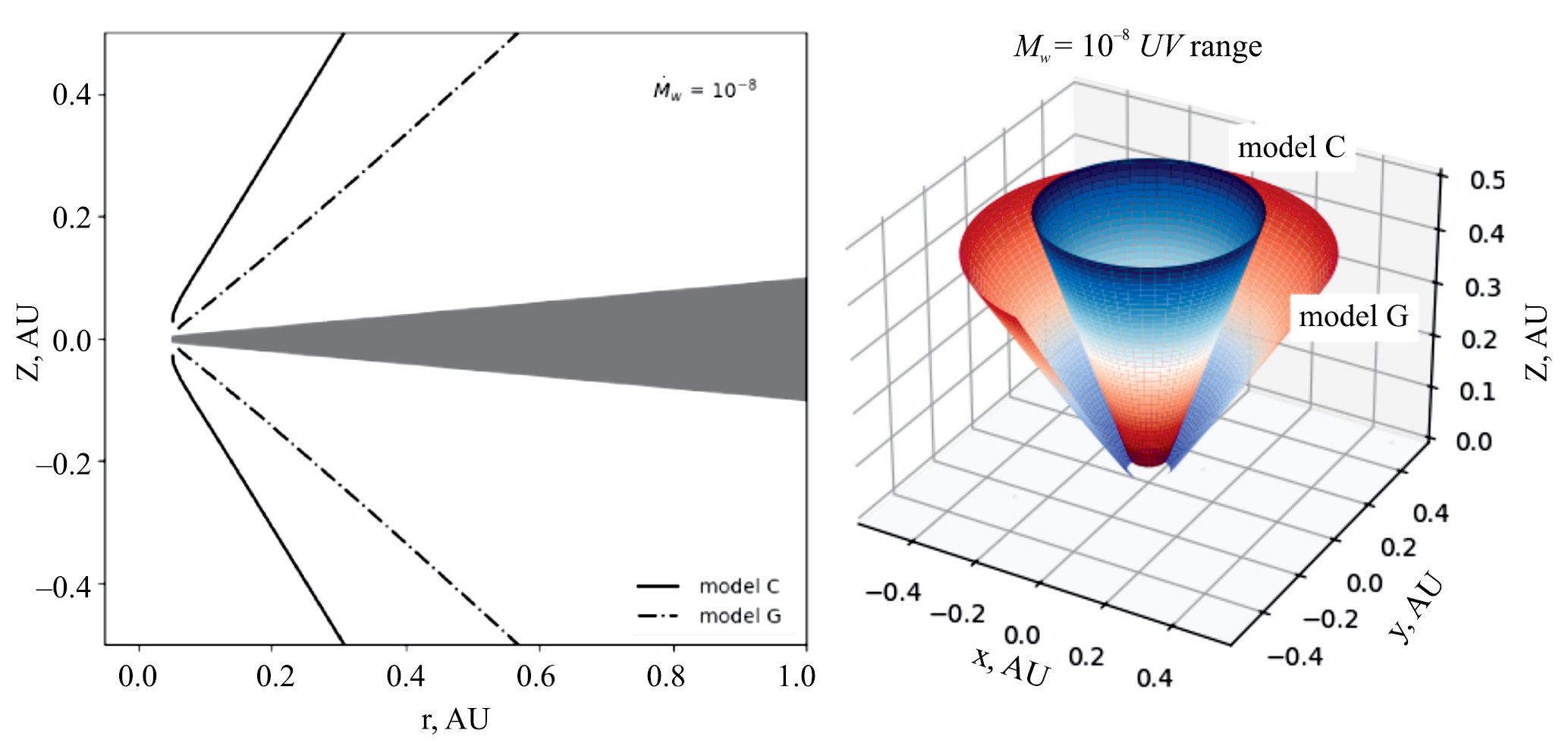 В итоге, исходными параметрами моделей являются: и – внутренний и внешний радиусы области запуска ветра соответственно и – темп истечения вещества.