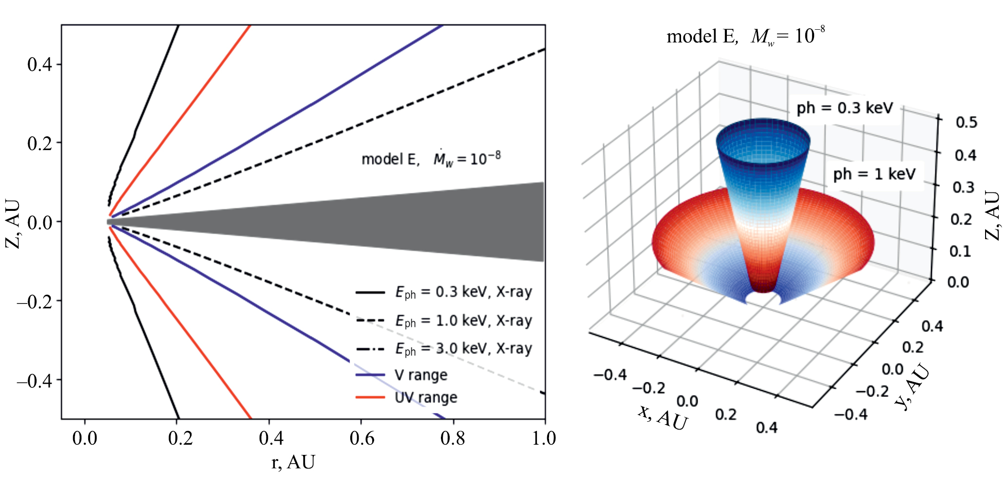 На рис. 7 слева показано сравнение сечений поверхностей для трех рассматриваемых энергий. Рисунок выполнен для модели E при темпе истечения /год, но его вид качественно отражает ситуацию во всех рассматриваемых моделях. Наибольшее поглощение достигается в мягком рентгеновском диапазоне ( кэВ). При этом поверхности для видимого (синяя линяя) и УФ (красная линяя) диапазонов всегда расположены между поверхностями, соответствующими энергиям 0.3 и 1.0 КэВ (сплошная и пунктирные линии соответственно), для всех моделей и всех значений темпа истечения. Заметим, что мягкое рентгеновское излучение аккреционных пятен, образующееся при аккреции за фронтом ударной волны (Ламзин, 1998), частично поглощается также в магнитосферах звезд типа Т Тельца в падающем на звезду потоке газа (Додин, 2018).