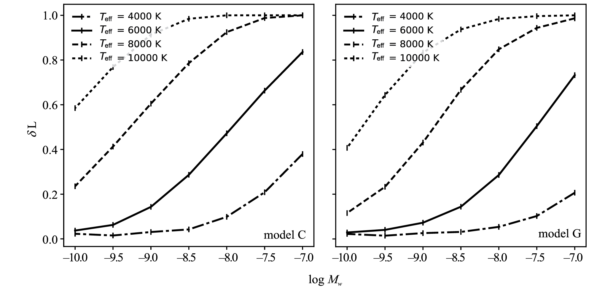 - Мы оценили также долю излучения звезды δL, поглощенную дисковым ветром. Для звезд типа Т Тельца с высоким темпом аккреции эта доля может достигать значений, близких к 1. Как и в случае предельных углов, наибольший эффект получается в моделях С. При этом, чем выше температура центрального источника, тем выше доля поглощенного ветром излучения. Это свойство дискового ветра присуще как газовой, так и пылевой компонентам ветра. Это означает, что излучение горячих аккреционных пятен на звезде может быть важнее для термодинамики ветра, чем излучение фотосферы звезды с эффективной температурой 4000 K.