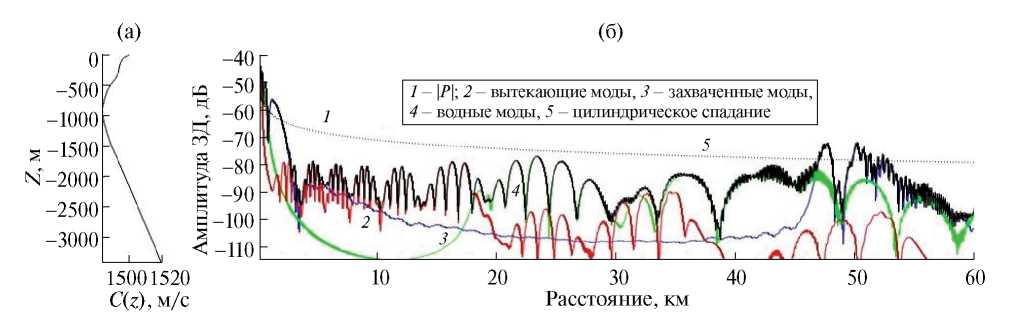 Рассмотрим далее аналогичные результаты, полученные в реальном волноводе в летних условиях. Вертикальное распределение скорости звука (ВРСЗ) в выбранном районе Северной Атлантики к западу от Ла-Манша показано на рис. 2а. Глубина моря h = 3417 м, параметры грунта: скорость звука c1 = 1600 м/с, плотность ρ1 = 1.5 г/см3, потери – 0.14 дБ/λ1. Для этого района рассчитаны зависимости от расстояния амплитуды ЗД и ее составляющих – вытекающих, захваченных и водных мод (рис. 2б).