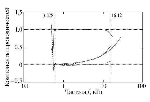 Рис. 8. Компоненты проводимостей покрытия с глицерином и компенсаторами. Обозначения те же, что и на рис. 6.