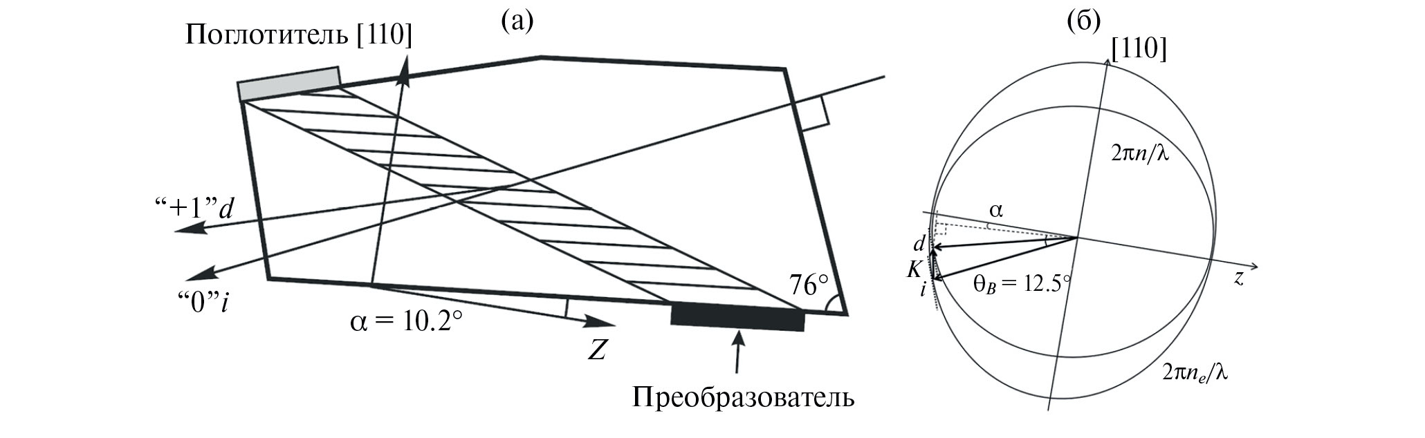 В АО фильтрах на основе кристалла парателлурита используется анизотропная дифракция света со сменой поляризации дифрагированного излучения [6–8]. Дифракция происходит на медленной акустической моде, распространяющейся в плоскости под углом α к направлению [110] кристалла. В нашей работе использовалась ячейка с углом среза α = 10.2°. Сдвиговая акустическая мода имела скорость см/с и распространялась с углом акустического сноса 54° (рис. 1). Длина преобразователя в плоскости АО взаимодействия равнялась L = 5 мм. Акустическая волна на рисунке условно показана горизонтальными штрихами. Угол наклона входной оптической грани кристалла парателлурита составлял 76°. На рисунке показан ход основного и дифрагированного световых лучей на выходе фильтра. Это лучи нулевого и первого порядков дифракции.