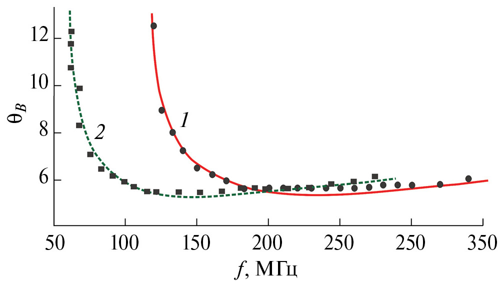 Рис. 3. Экспериментальные и теоретические зависимости угла падения света необыкновенной поляризованной оптической волны с длиной волны λ = 0.633 мкм (кривая 1) и λ = 1.15 мкм (кривая 2) от частоты ультразвука