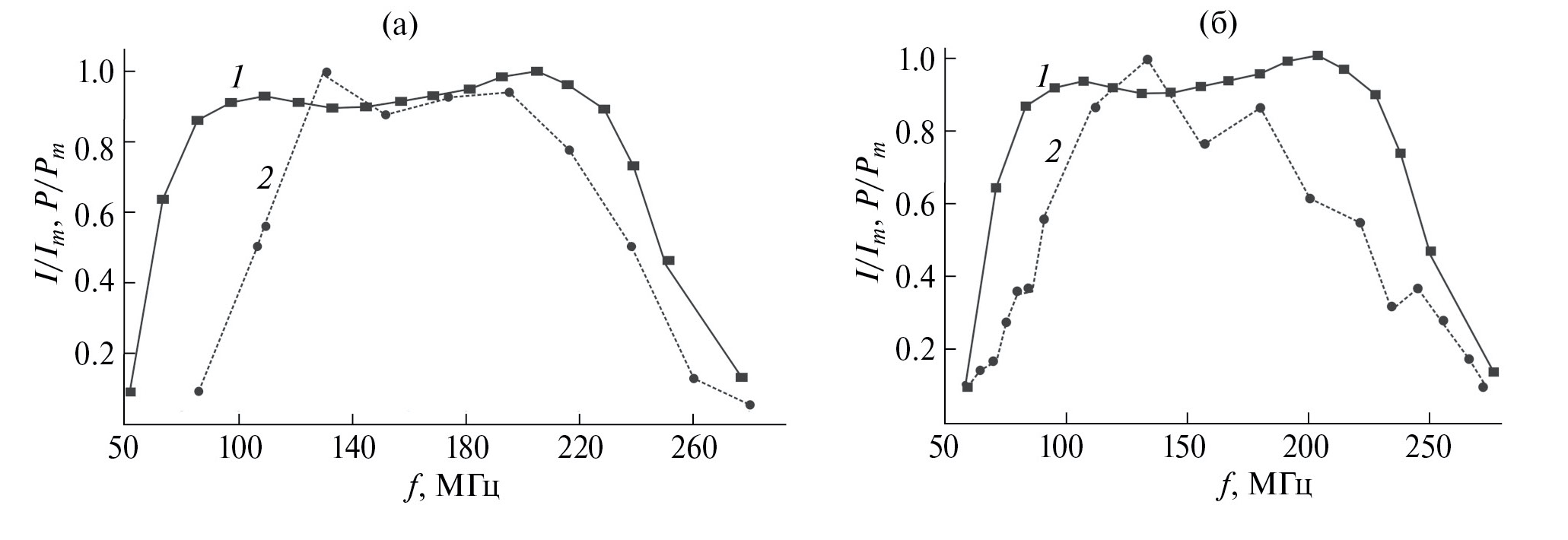 Аналогичный результат был получен при измерениях в ИК диапазоне (рис. 4б). В этом случае, в соответствии с рис. 3, пришлось заменить согласующие элементы преобразователя, чтобы сдвинуть полосу эффективного возбуждения ультразвука в более низкий частотный диапазон. Вследствие этого изменилась форма частотных характеристик. Однако обнаруженное в работе несоответствие частотных характеристик, измеренных оптическим и ВЧ методами, проявилось с той же тенденцией: электрические измерения дали более широкую полосу возбуждения ультразвука по сравнению с оптическим методом. Как следует из графиков, в первом варианте Δf = 120 МГц, а во втором – 135 МГц.