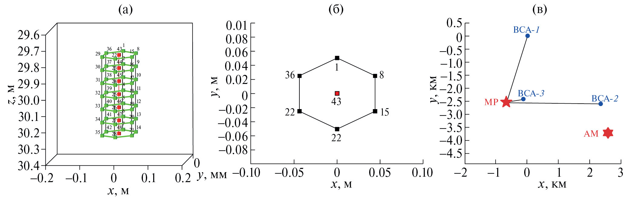 Способ формирования векторных приемников показан на примере одного горизонтального кольца (рис. 1б). В вертикальной плоскости векторные приемники формируются аналогичным образом: из соседних скалярных элементов отдельно для каждой пары гидрофонов и для каждой вертикальной нити [14]. В сконструированной таким образом векторно-скалярной антенне (ВСА) общее число приемных каналов равно 132. Из них 48 – исходные скалярные приемники, образующие скалярную антенну, 42 – векторные приемники, оси которых расположены в горизонтальной плоскости, и 42 векторных приемника, оси которых расположены в вертикальной плоскости.