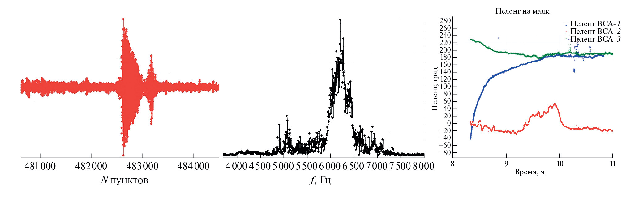 На рис. 2 изображены временная реализация опорного сигала (рис. 2а) и его спектр на одиночном приемнике (рис. 2б). На рис. 2в представлены оценки направления на “маяк” приемными антеннами ВСА-1, 2 и 3 в зависимости от времени наблюдения. Видно, что в принятых сигналах на фоне помех отчетливо выделяется ЛЧМ-сигнал “маяка” в полосе частот 6.0–6.5 кГц длительностью 30 мс, с интервалом между импульсами 0.9 с.