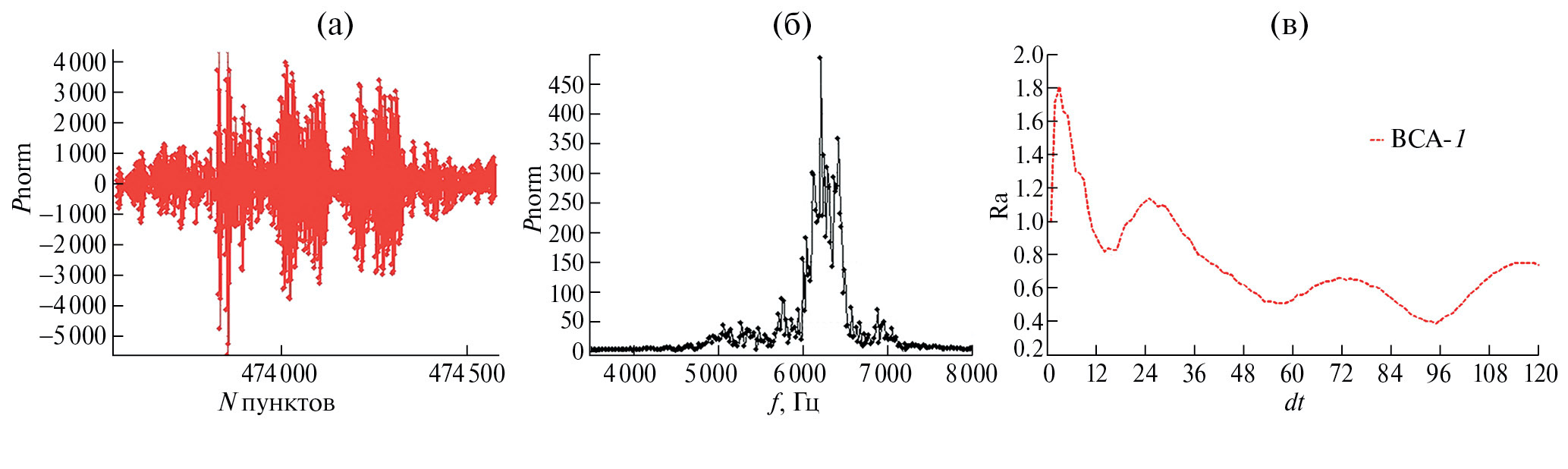 Рис. 2. (а) – Осциллограмма и (б) – спектр сигнала “маяка” на первом канале приемного модуля ВСА-2 после низкочастотной фильтрации, а также (в) – оценки по акустическим сигналам направлений на “маяк” антеннами ВСА-1, ВСА-2 и ВСА-3.