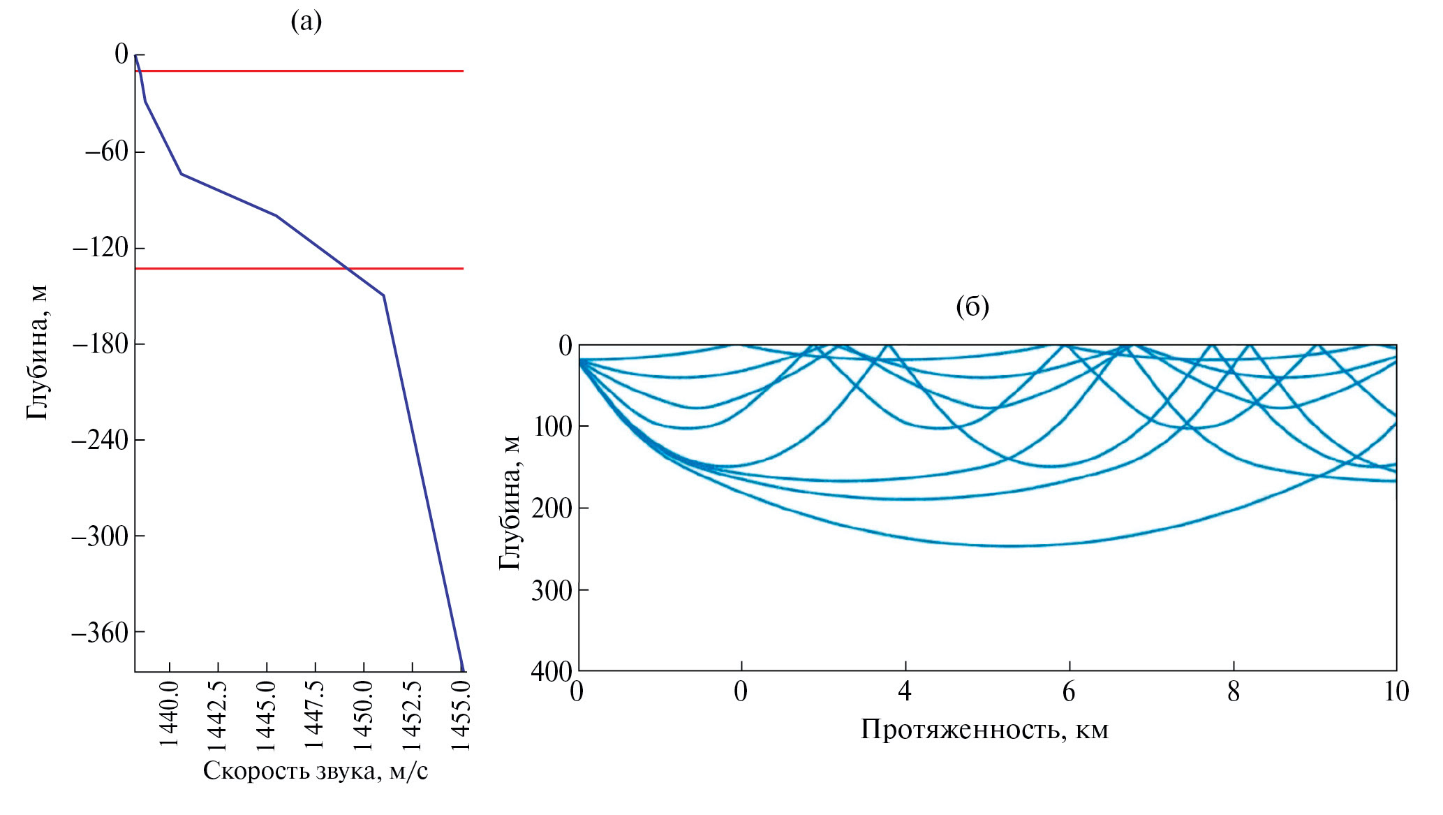 При оценке глубины использовалась информация о вертикальном распределении скорости звука (ВРСЗ) и лучевой структуре звуковых сигналов в районе работ (рис. 5). На рис. 5 хорошо видно, что при проведении экспериментов в зимних условиях наблюдается ярко выраженный приповерхностный канал. Донными отражениями при малых глубинах приема и излучения можно пренебречь, что упрощает оценку глубины и АМ, и МР.