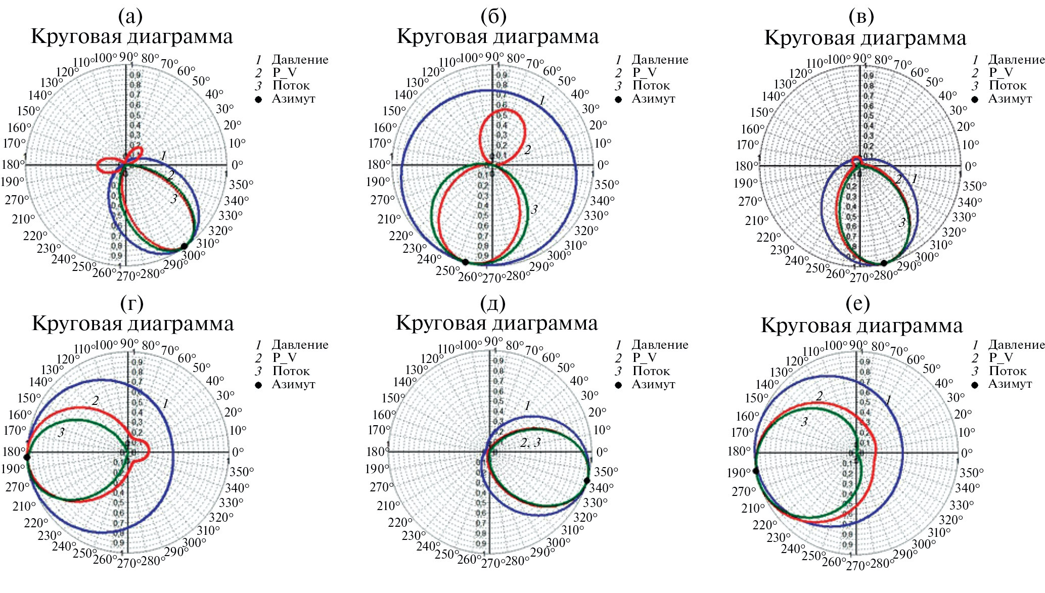 Рис. 7. Примеры оценки направлений на источники сигналов приемными модулями (а), (б) – ВСА-1, (в), (г) – ВСА-2, (д), (е) – ВСА-3: (а), (в), (д) – направления на “маяк” и (б), (г), (е) – на источник МР.
