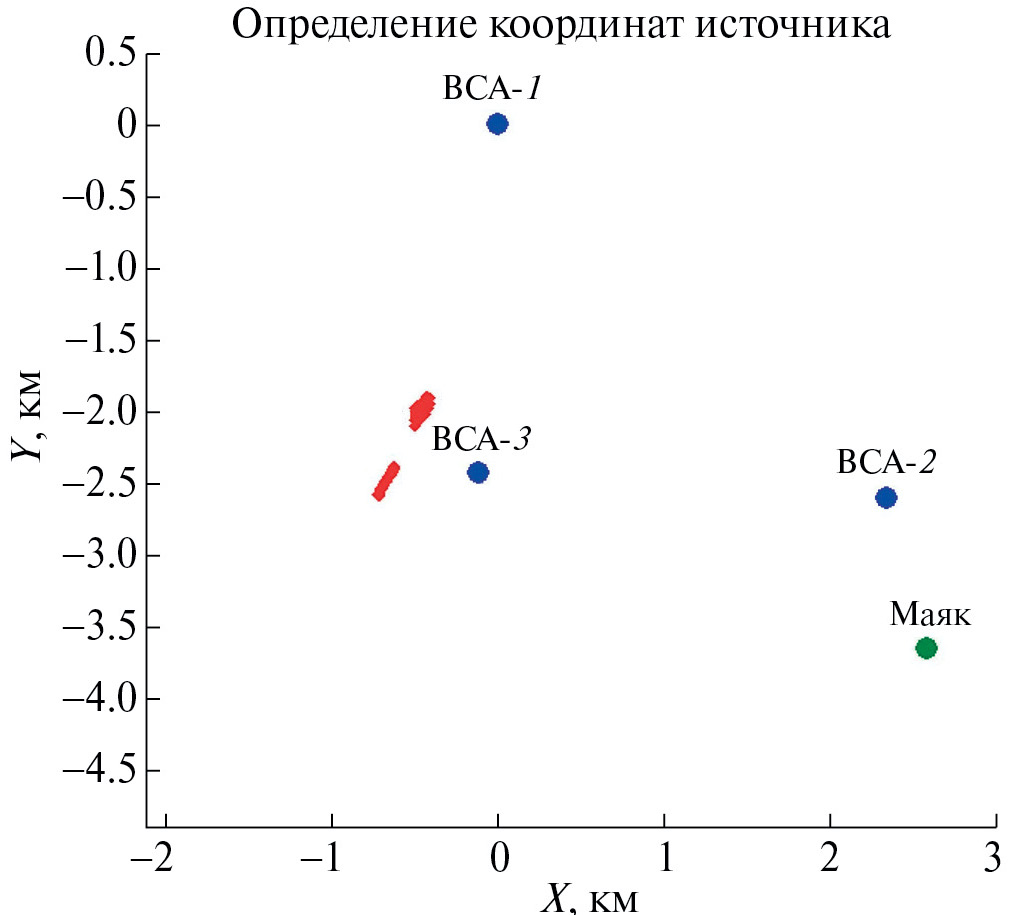 - Для отработки технологии оценки глубины движущегося источника выполнена предварительная оценка координат источника шума в контролируемых (известных) условиях с применением стационарного излучателя – “маяка”. Одновременно этот маяк с известными координатами использован для устранения возможных смещений пеленгов, которые возникают под действием подводных течений [15].