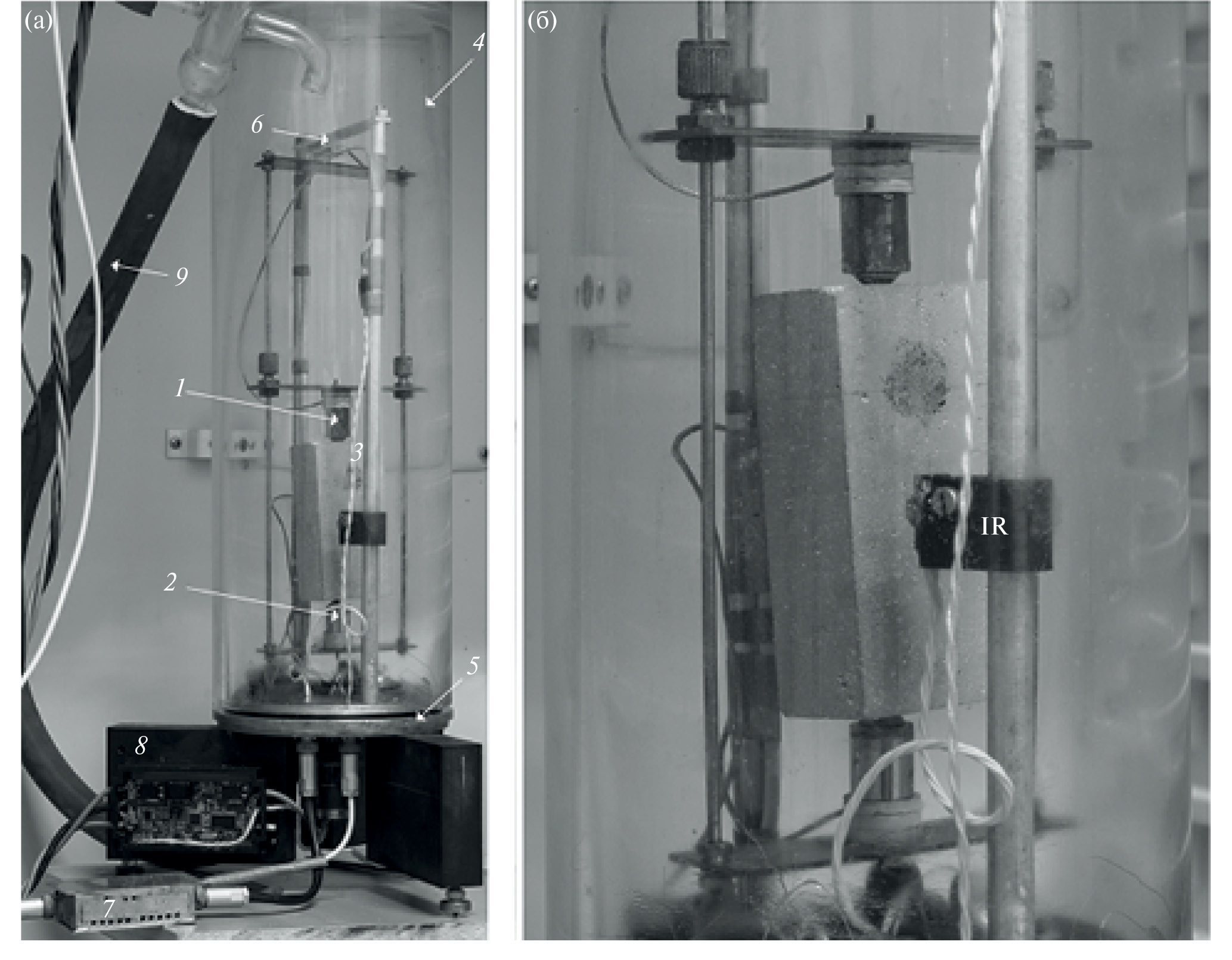 Схема контроля температуры, давления и влажности, использованная в работе [17], оказалась непригодной для длительного использования: в конце измерений электроника, размещенная внутри контрольного объема, оказалась неисправна из-за коррозии и перегрева в условиях низкого давления. Авторы представленного исследования учли обнаруженные недостатки и внесли изменения в схемы контроля термодинамических условий, при которых проводятся акустические измерения: все электронные компоненты, выделяющие тепло, были вынесены за пределы замкнутого объема (элементы 7 и 8 на рис. 1). Сами преобразователи, имеющие малое потребление энергии, размещались либо на латунном основании (элемент 5 на рис. 1), либо на металлических опорах, которые имели тепловой контакт с нижним металлическим основанием, что хорошо видно на рис. 1 для элемента 6 (балочного тензодатчика) и для бесконтактного инфракрасного термометра (датчик IR на рис. 1б), контролирующего нагрев образца при интенсивном возбуждении.