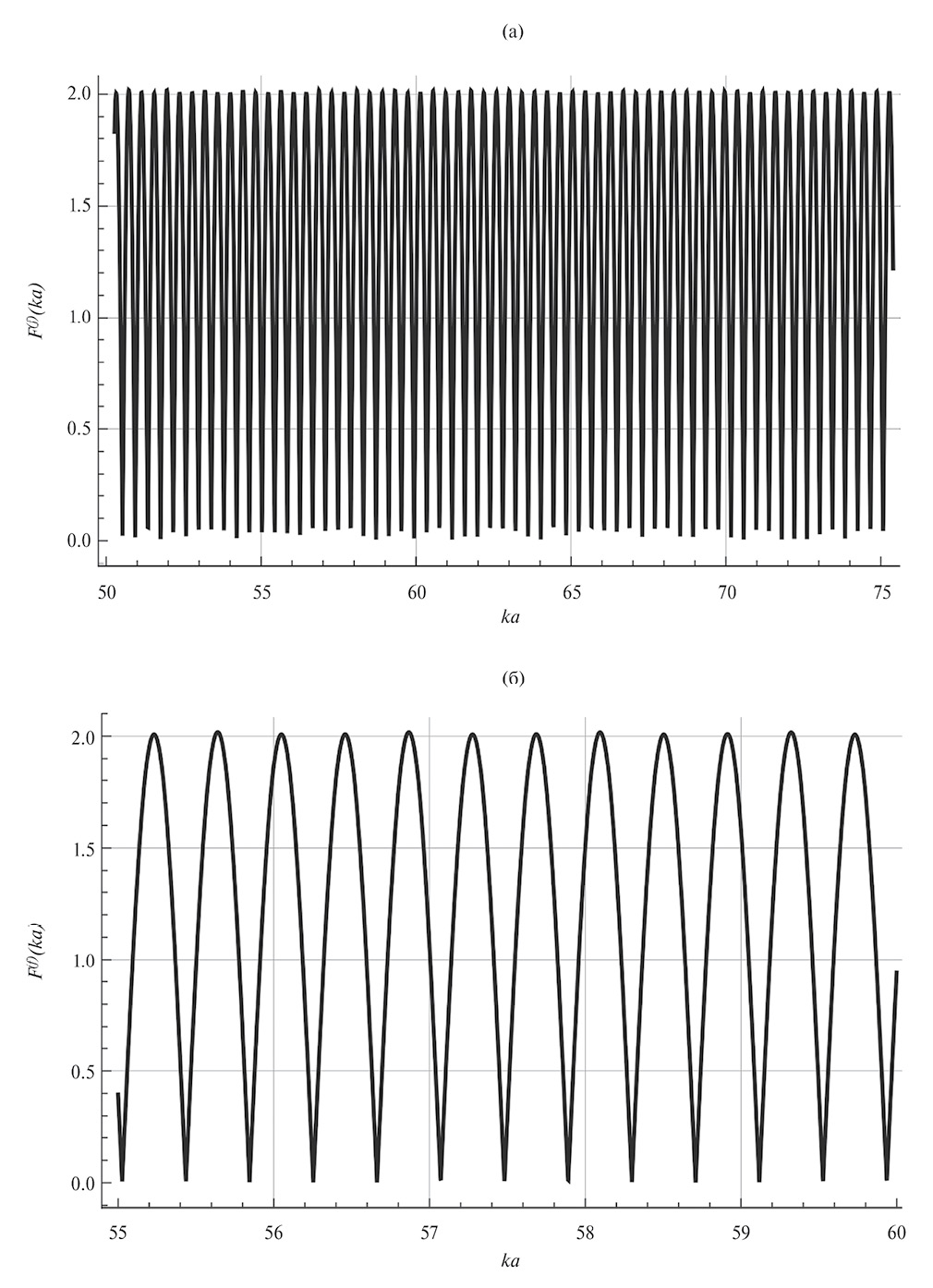 Рис. 5. Функция формы эхосигнала от двух акустически жестких сферических рассеивателей радиуса 0.3 м, находящихся в изотропном водном пространстве; y =50 м, ỹ = 45 м, z = = 20 м, d = 5м; (a) 40 ≤ f ≤ 60 кГц, (б) — 55≤ ka ≤ 60 .