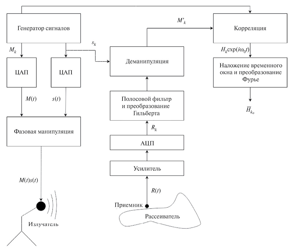 Данный метод хорошо работает, когда в качестве источника используется широкополосный излучатель. Однако, в рамках настоящей работы проводится исследование дифракции ультразвуковых волн. Как известно, в ультразвуковом диапазоне эффективные излучатели звука являются резонансными, т.е. имеющими узкую частотную полосу. В таком случае использование в качестве посылки широкополосного сигнала не является оптимальным решением, и возникает необходимость модифицировать метод M -последовательности, чтобы расширить его применимость на случай узкополосных излучателей. Опишем данную методику. Блок-схема метода приведена на рис. 2.