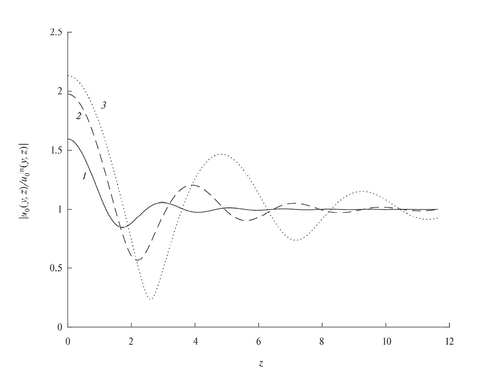 Была также измерена зависимость полного поля за пределами поверхности конуса u0(y, z) в случае аксиального расположения источника, вычисляемого с помощью выражений (12)–(13), от радиального параметра z = αk(r – αx) при фиксированном значении аксиального параметра y. Отметим, что рядом с поверхностью конуса возникает интерференция падающего и рассеянного полей, затухающая по мере отдаления от поверхности, причем интерференция усиливается с увеличением аксиального параметра y (см. рис. 7).