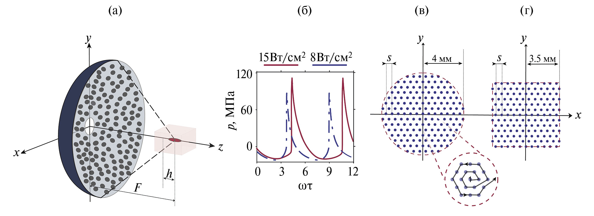 Рис. 1. (а) — Схема численного эксперимента. Ультразвуковой пучок создается рандомизированной HIFU–решеткой (256 круглых элементов диаметром 6.6 мм) с апертурой 128 мм, рабочей частотой 1.2 МГц, фокусным расстоянием F = 120 мм. Фокусировка происходит в образец ткани говяжьей печени на глубину h = 2.5 см, излучатель и образец ткани помещены в воду. (б) — Профили давления в фокусе решетки в ткани для режима насыщения (I₀ = 15 Вт/см², красная линия) и режима с формированием развитого разрыва (I₀ = 8 Вт/см², синяя штрихпунктирная линия). (в, г) — Дискретные траектории однократного воздействия на каждый фокус, ограниченные внешним контуром в виде равных по площади (в) — окружности радиуса 4 мм и (г) — квадрата со стороной 7 мм; фокусы расположены на равномерной сетке с шагом s. Спиралевидная последовательность электронного перемещения фокуса решетки показана в выделенном круге стрелкой (из центра наружу).